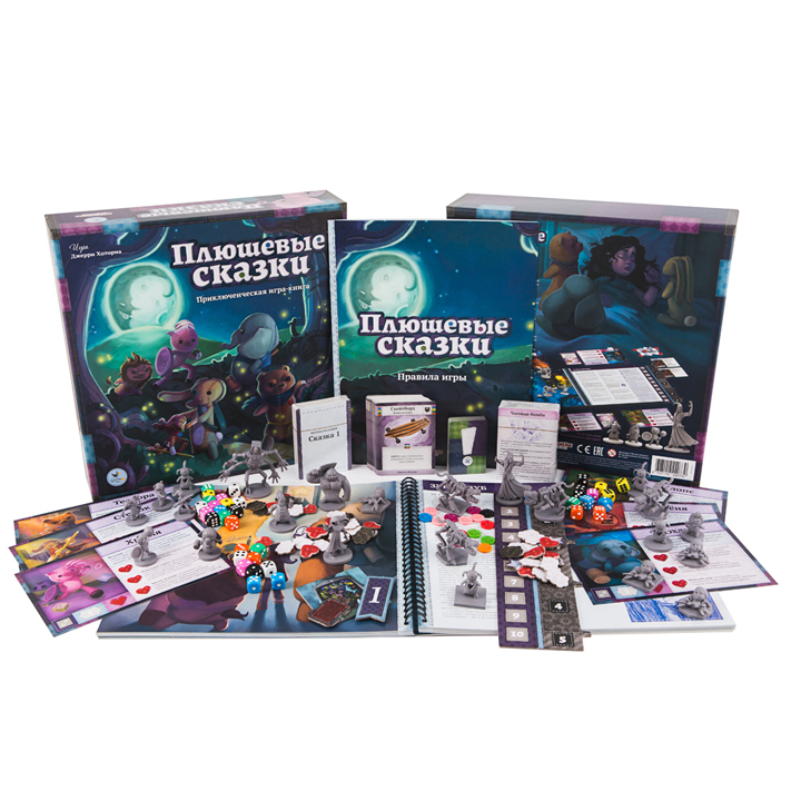 "Плюшевые сказки" – это кооперативная приключенческая игра для 2-4 игроков от семи лет. Игроки становятся плюшевыми игрушками, оживающими, когда засыпает их маленькая хозяйка. Герои отправляются в таинственный неизведанный край, чтобы защитить девочку от злодеев, спрятавшихся под кроватью. Главный элемент игры – перекидная книга сказок, включающая в себя не только иллюстрации и художественный текст, но также локации и игровые поля. В дополнение к привычным предметам и врагам, используемым в каждом приключении, в игре есть колода находок с тайными картами, предназначенными для определённых сказок. Вас ждёт семь приключений. Каждое займёт около двух часов. Чтобы начать приключение, просто начните читать, и текст направит Вас в нужную сторону.