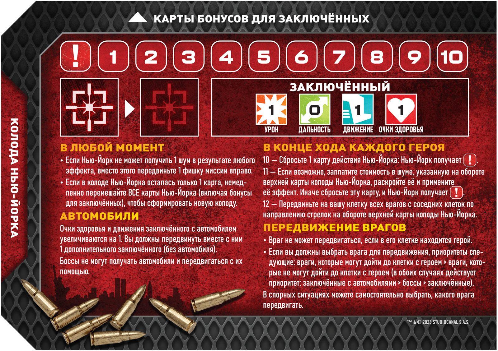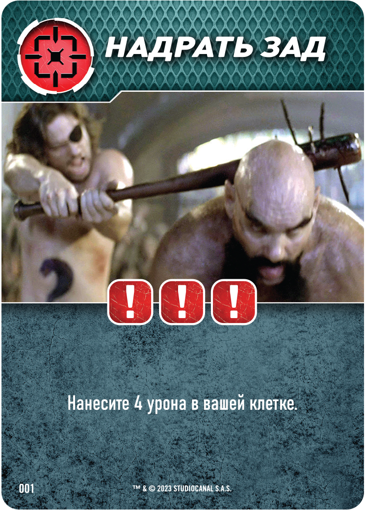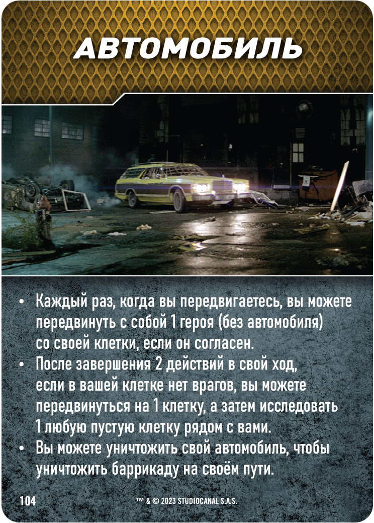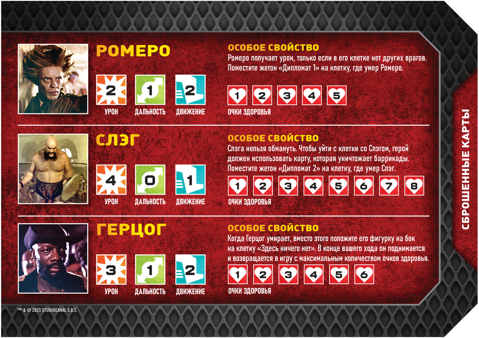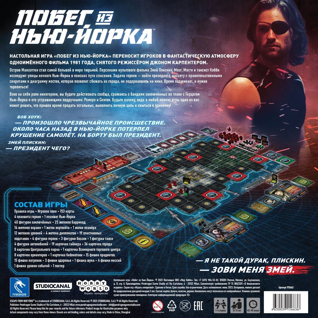В данной настольной игре, основанной на знаменитом кинофильме, участников ждет суровое приключение, полное опасностей и неожиданных поворотов. Возьмите под свой контроль одного из героев картины и попробуйте выжить в разрушенном Нью-Йорке мрачного будущего. Работая вместе, или поодиночке, найдите на полных опасностях улицах три предмета, которые обеспечат вам свободу. При этом, у вас есть и личная цель, успешное выполнение которой обеспечат победу лично вам. Столкнитесь с бандами и постарайтесь использовать отведенное время по максимуму - часики тикают, и до рассвета нужно успеть завершить миссию...