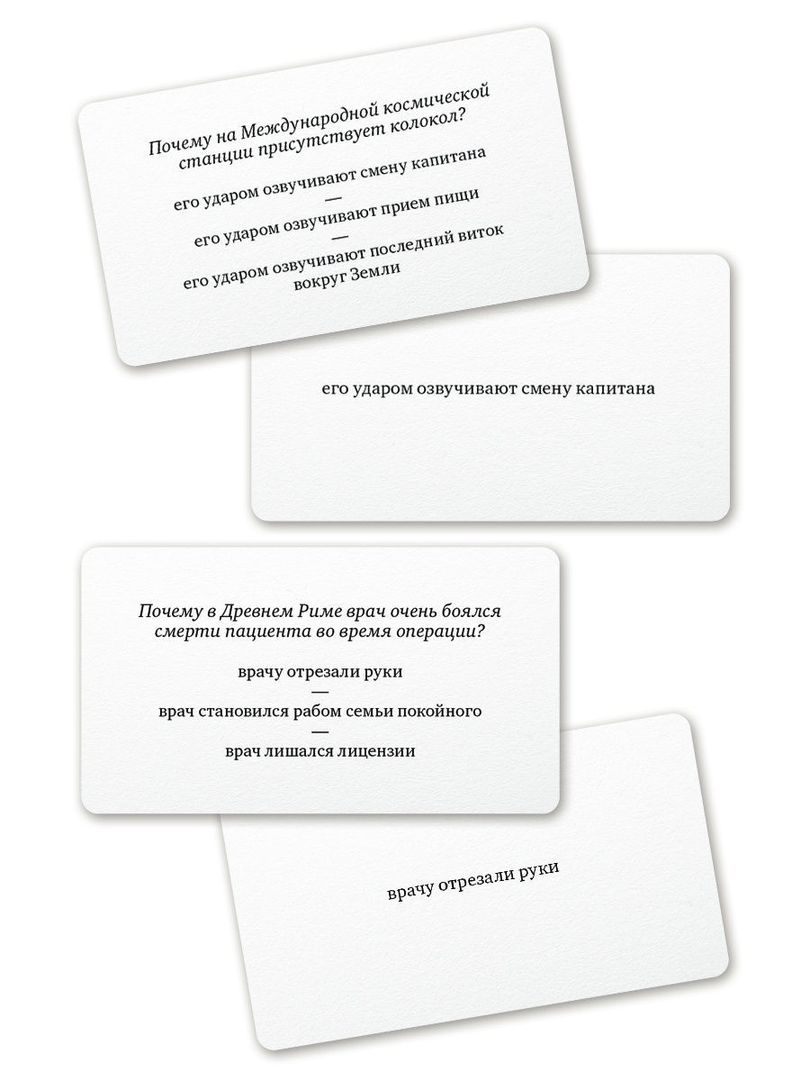 Внутри небольшой коробки вас ждут множество карточек с необычными вопросами о малоизвестных вещах в нашем обществе. Под вопросом вы найдете три варианта ответа, из которых только один является верным. Сможете угадать, какой? Игрок, ответивший правильно на большинство вопросов, станет победителем!