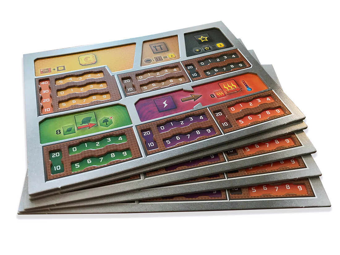 Благодаря этим двусторонним планшетам вы сможете надежно закрепить игровые компоненты, и теперь они не будут разлетаться во всему столу ввиду особо жарких баталий. Также с помощью пронумерованных ячеек игроки смогут удобно отслеживать количество своих ресурсов.