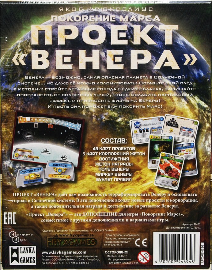 Освоение Марса прошло успешно, и теперь пора отправляться на Венеру! В данном дополнении для знаменитой стратегии игроки постараются обуздать крайне неблагоприятную атмосферу планеты Венера. В игру добавляются новые карты проектов, корпораций и новый ресурс - аэростаты. Благодаря этому участники получат больше путей к достижению победы и возможность получить специальную награду. Терраформирование продолжается! *Внимание! Это не самостоятельная игра. Вам понадобится базовый набор игры "Покорение Марса".