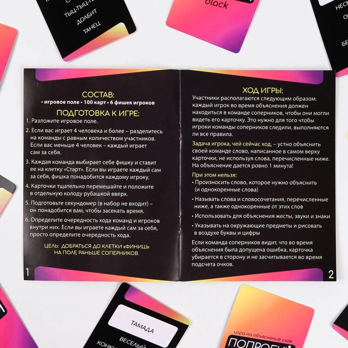 Игрокам предстоит объяснить как можно больше слов с карточек за минуту. При этом, нельзя использовать однокоренные и штрафные слова, а также жестикулировать и показывать на предметы в комнате. Задача усложняется, но увлекательности и веселья станет гораздо больше. В отличие от компактной версии, здесь игроков ждет игровое поле и больше карт со словами. Отгадавший игрок двигает свою фишку ближе к финишу. По итогу тот, кто первым преодолеет все игровое поле, станет победителем!