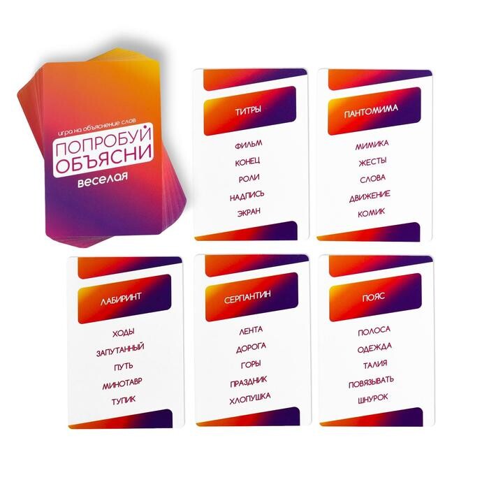 Готовы к веселому соревнованию? С данной игрой это будет очень легко сделать. В коробке вы найдете множество карт со словами, которые нужно объяснять другим игрокам. Одна загвоздка - на каждой карте указано три слова, которые нельзя использовать при объяснении искомого. Из-за этого часто задача немало усложняется, но это только добавляет интереса и веселья. Помимо карт, в комплекте вы найдете небольшое поле, на которое выставляются фигурки участников. Если смогли отгадать раньше остальных, двигайтесь по полю. Кто сможет первым добраться до финиша?