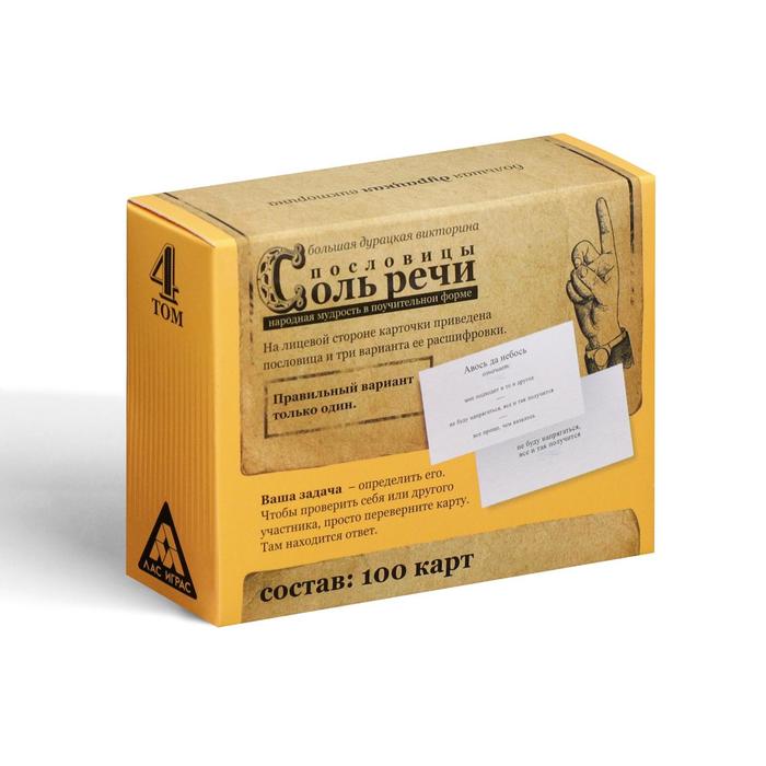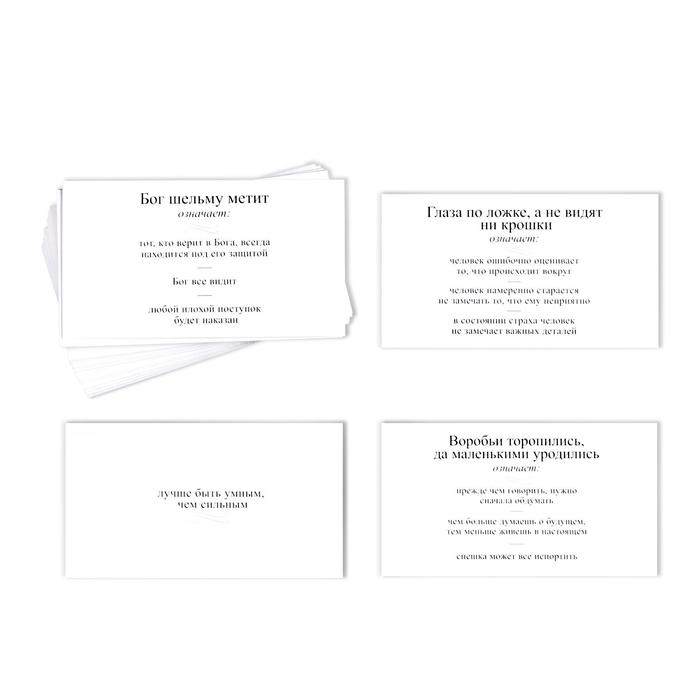 Данная викторина содержит множество карт с пословицами, известными и не очень. На карте указано три варианта значения той или иной пословицы, а задачей игроков станет назвать правильное значение. Кто сможет это сделать, получит карту себе. Игрок, набравший наибольшее количество правильных ответов, станет победителем!
