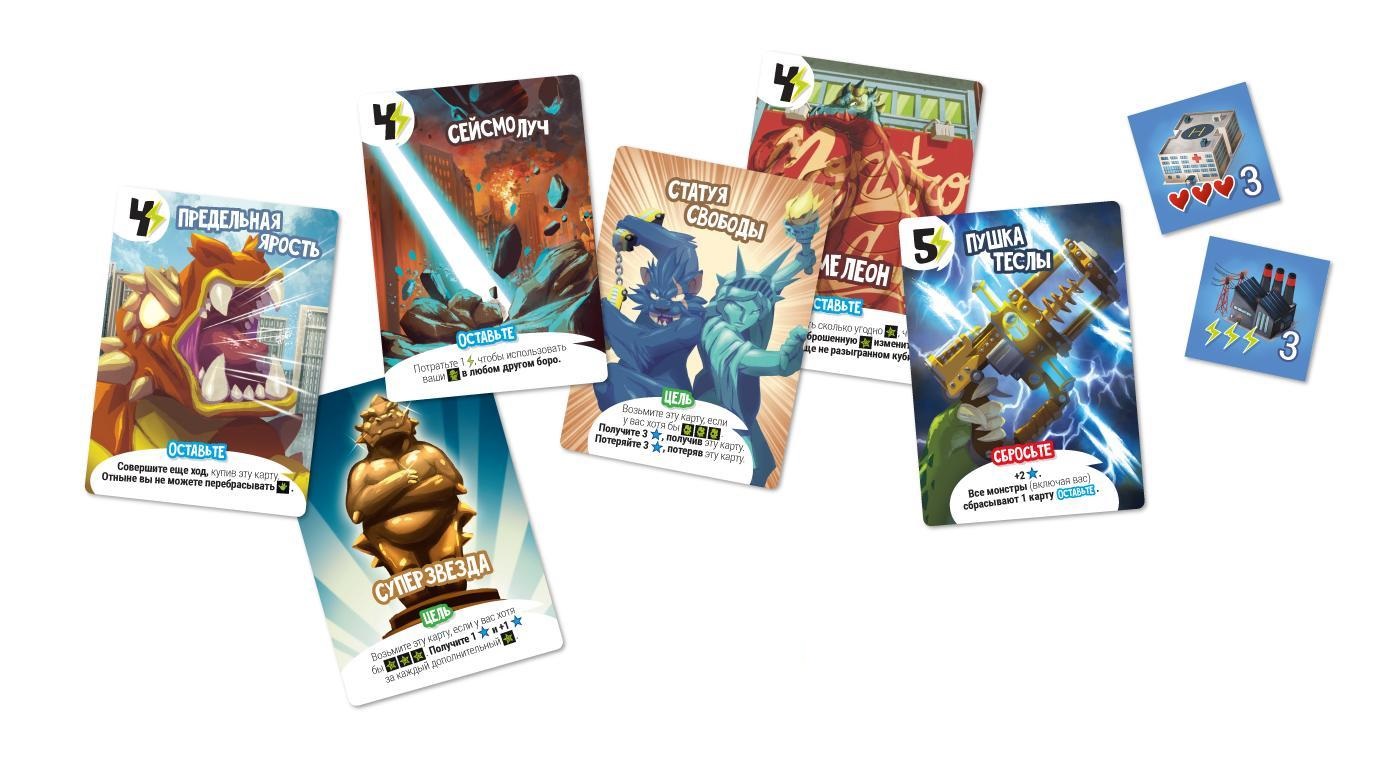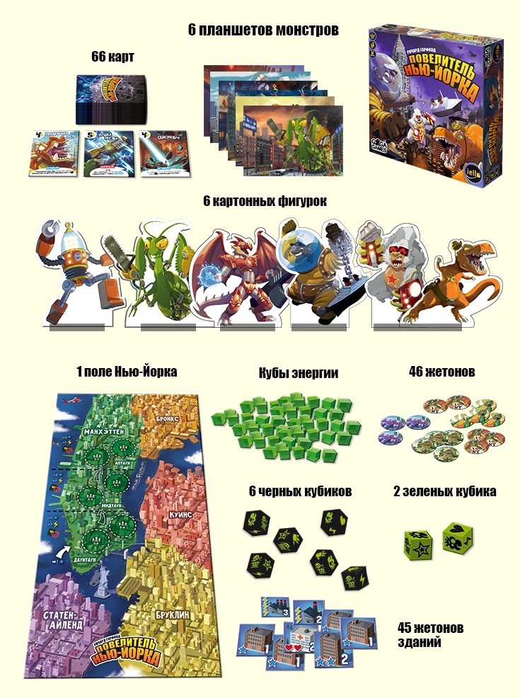 Готовьтесь к эпичной битве, в которой решится судьба самого известного мегаполиса! В роли гигантских монстров игрокам предстоит побороться с друг другом за право захватить Нью-Йорк. Это получится сделать, набрав двадцать победных очков, но путь к ним будет долог и тернист. Бросая кубики, участники выполняют ряд действий, в зависимости от выпавших значений - они могут атаковать друг друга, излечивать свои раны, а также получать уникальные способности. Не стоит забывать, что вы огромный монстр, который может разрушать здания, поэтому стоит этим воспользоваться для получения бонусов. Но будьте осторожны - чем больше разрушений, тем интенсивнее будет ответ армии, нагрянувшей в город. Пробудите свою мощь, оставьте других не у дел и станьте настоящим повелителем Нью-Йорка!