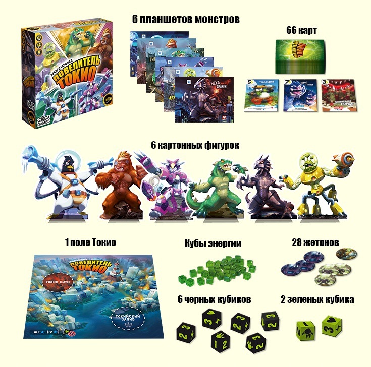 Каждый из участников берёт на себя роль одного из сокрушительных монстров, каждый из которых будет бороться за контроль над столицей страны восходящего солнца! Бросая кубики и используя способности, игроки будут сражаться, восстанавливать очки здоровья, получать победные очки и генерировать энергию для получения более мощных способностей. В процессе схватки каждый из монстров может занять Токио и стать его повелителем, что даст ему дополнительные победные очки в конце раунда, но так же сделает из него мишень для всех остальных игроков, которые будут стараться не промахиваться. Настольная игра Повелитель Токио – это лучший вариант для игры в компании, игра проста в освоении, динамичная и весёлая. Интересная задумка и красочное оформление делает её подходящей как новичкам, так и опытным игрокам.
