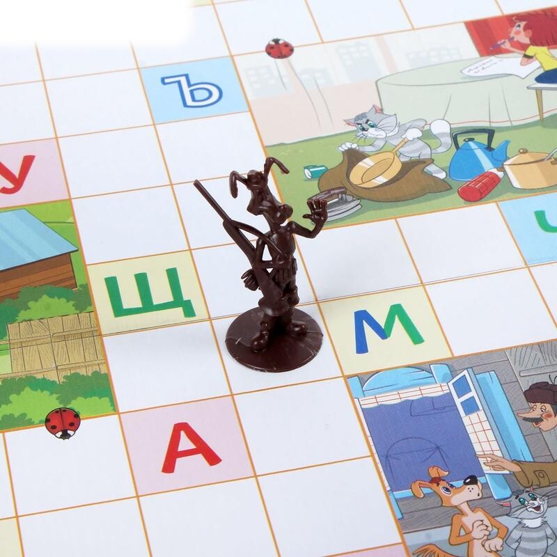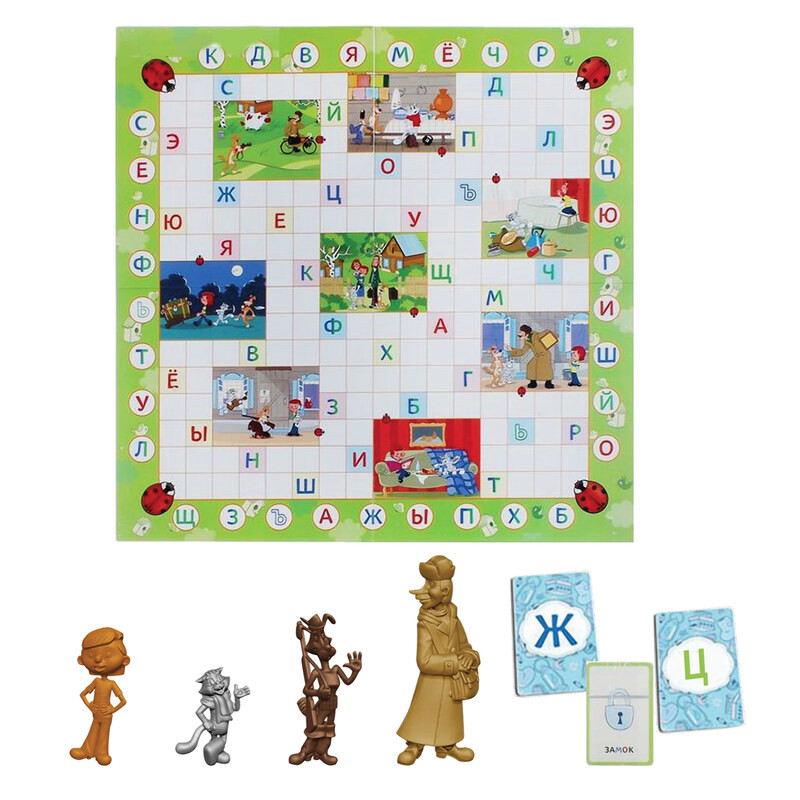 Путешествуйте по игровому полю с фигурками любимых героев мультфильма и узнайте, как из букв формируются слова!