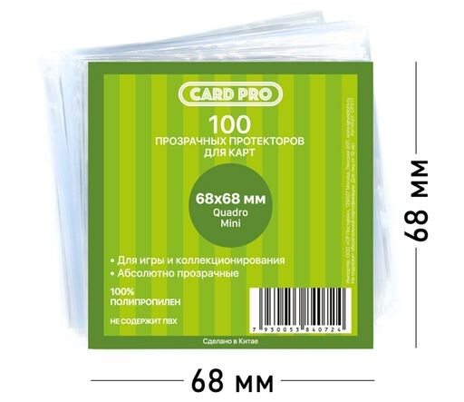 Прозрачные протекторы от производителя Card-Pro помогут сохранить вашу колоду в первоначальном виде, препятствуя загрязнению и затиранию карт. В упаковке вы найдете сто тонких протекторов для карт размера 68x68мм.