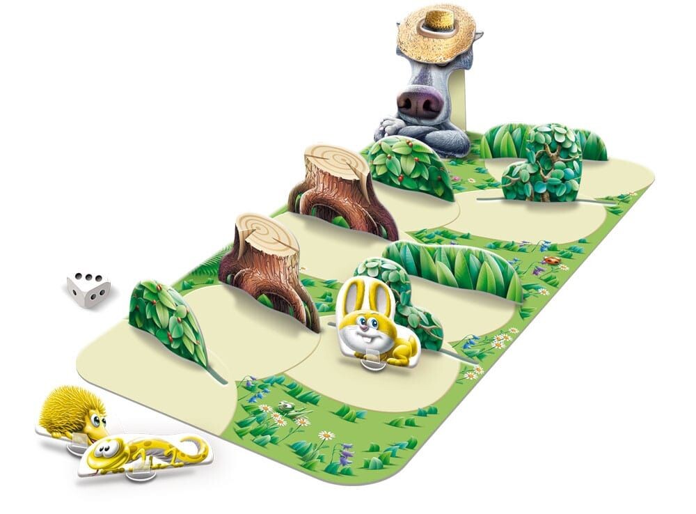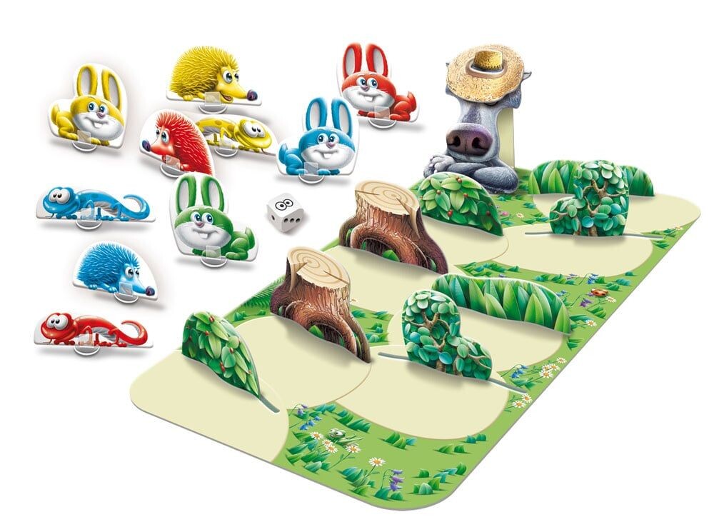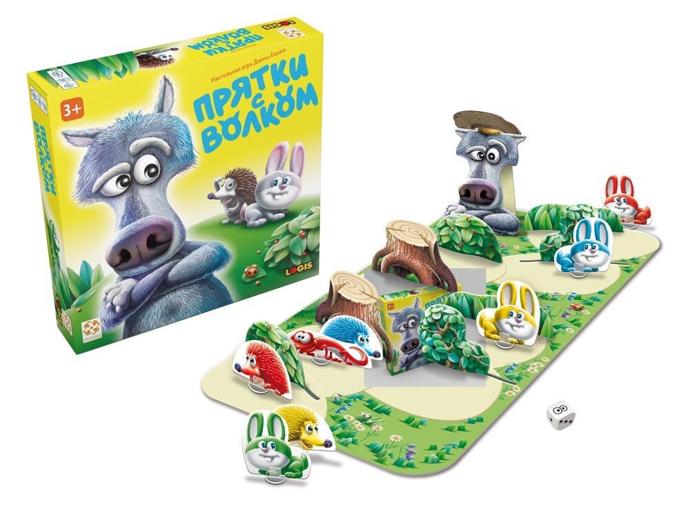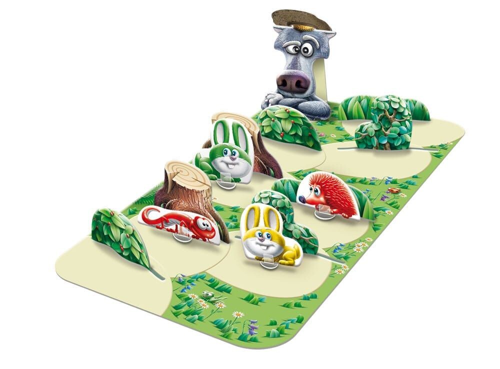 В данной детской игре участники получат под свой контроль группу из трех животных на каждого игрока. Бросая кубик, игрок будет передвигать одного из своих подопечных на то количество шагов, которое указано на кубике. На игровом поле вы найдете кусты и пни, за которыми можно спрятаться от волка. И это очень пригодится, ведь если после броска кубика выпадет символ глаза, волк проснется, и тогда все животные, которые не спрятались, должны будут вернуться к старту.