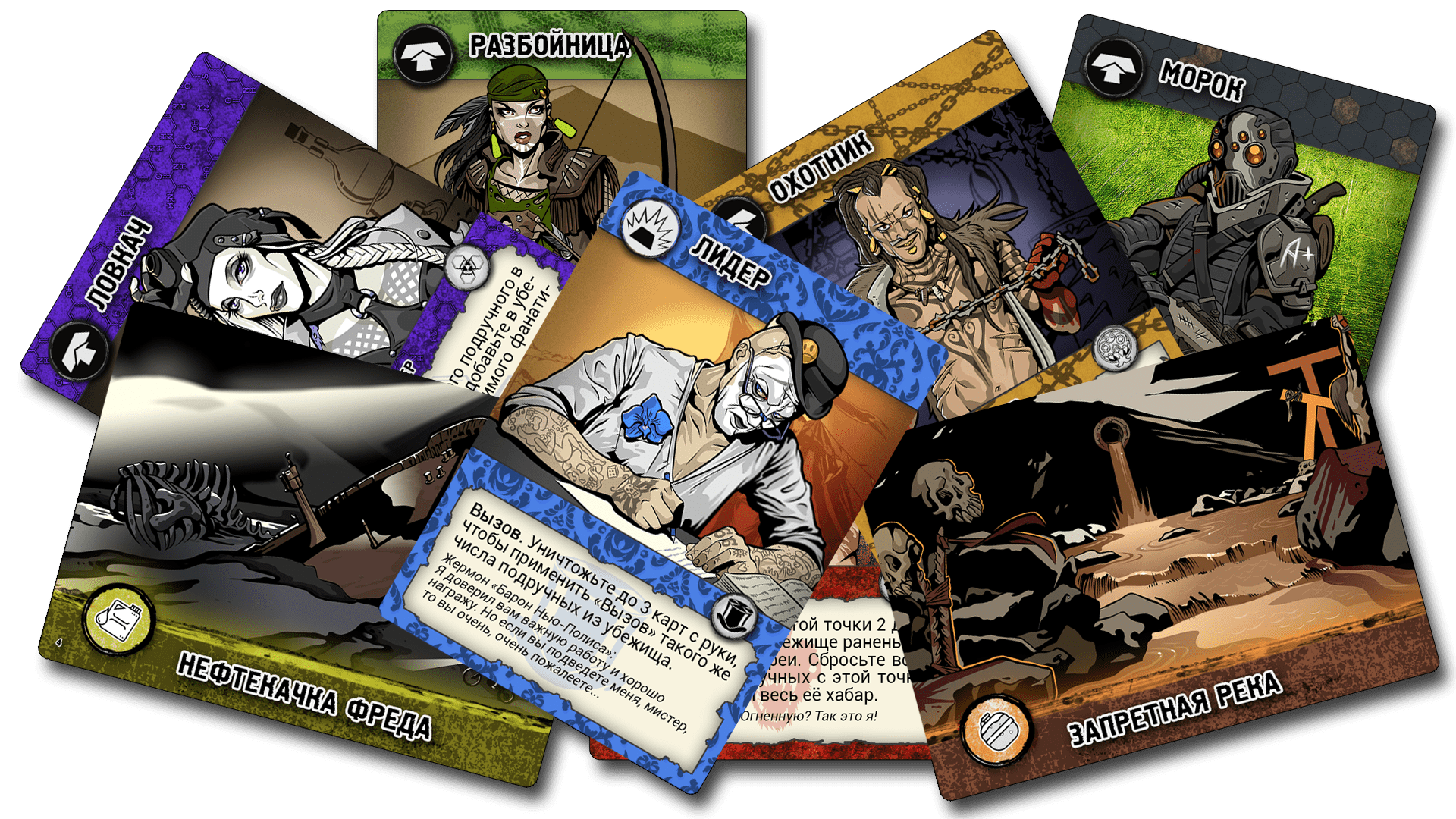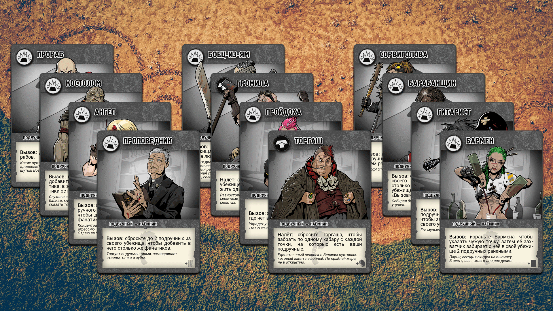 В данной настольной игре станут главарями банд рейдеров, жестоких головорезов, ищущих свое место под солнцем. Игра длится несколько раундов, в которых вам предстоит сражаться друг с другом за территории с помощью карт бандитов, и стараться забрать хабар для получения победных очков. Своих наемников можно улучшать и стараться выложить их большим числом, чем есть на базе соперника. Тогда вам улыбнется удача, и победа станет чуть ближе. Все это дополнено яркими иллюстрациями, отсылающими ко множеству знаменитых представителей жанра. Открывайте коробку и окунитесь в притягательную атмосферу постапокалипсиса!