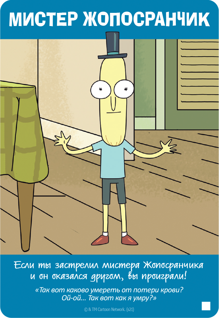 Кто есть кто? В данной командной игре, основанной на серии знаменитого мультсериала, игрокам, действуя сообща, нужно понять, кто является пришельцем и скрывается под личиной нормального человека. Более того, его еще надо успешно ликвидировать, в чем вам помогут карты персонажей, каждая из которых обладает своим уникальным эффектом. Советуйтесь друг с другом и постарайтесь сделать так, чтобы ваши действия были не слишком катастрофичны, ведь если погибнет слишком много незараженных людей, участники проиграют! Вы также можете попробовать игровой режим, в котором уже один из игроков станет пришельцем, и это внесет большое разнообразие в правила! Собирайтесь дружной семьей и замочите этих пришельцев, залезших к вам в дом!