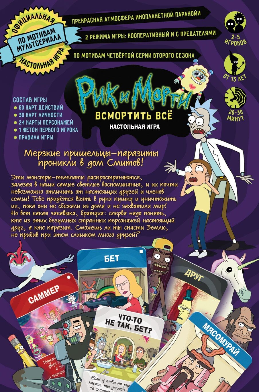 В данной командной игре, основанной на серии знаменитого мультсериала, игрокам, действуя сообща, нужно понять, кто является пришельцем и скрывается под личиной нормального человека. Более того, его еще надо успешно ликвидировать, в чем вам помогут карты персонажей, каждая из которых обладает своим уникальным эффектом. Советуйтесь друг с другом и постарайтесь сделать так, чтобы ваши действия были не слишком катастрофичны, ведь если погибнет слишком много незараженных людей, участники проиграют!
