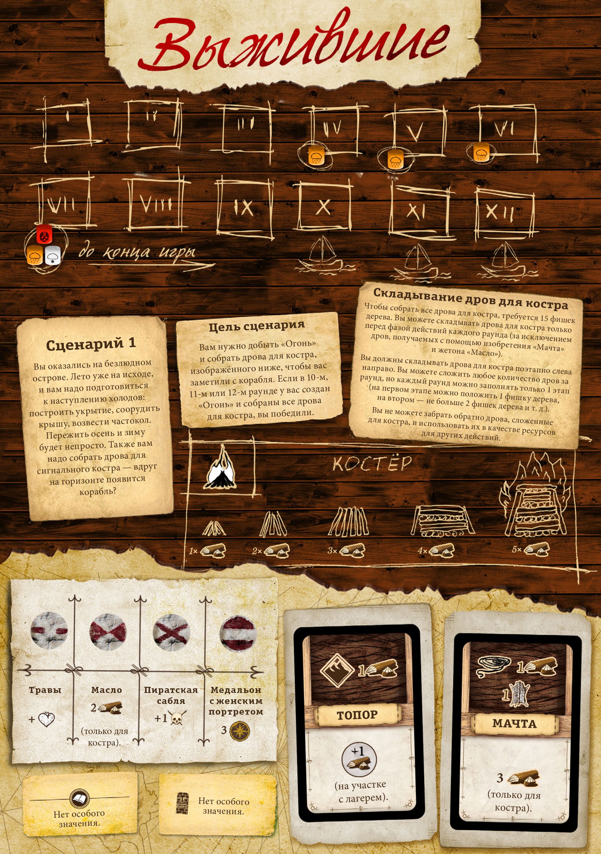 В "Робинзона" можно играть и вдвоём, а можно даже одному. В этом случае правилами игры предусмотрены специальные помощники – Пятница и верный пёс. А ещё игра предлагает усложнённые и упрощённые варианты игры, так что вы сможете настроить сложность под себя.