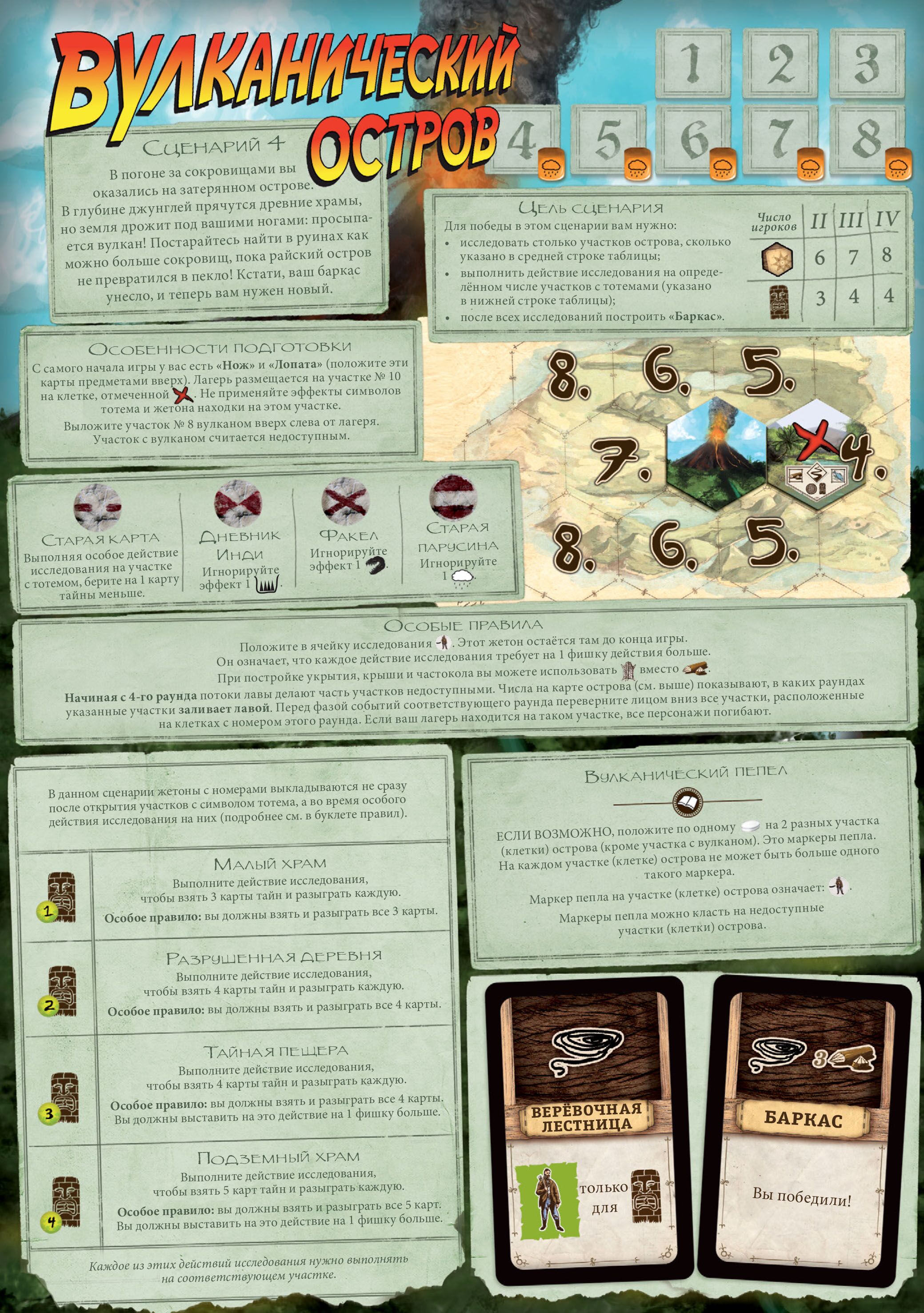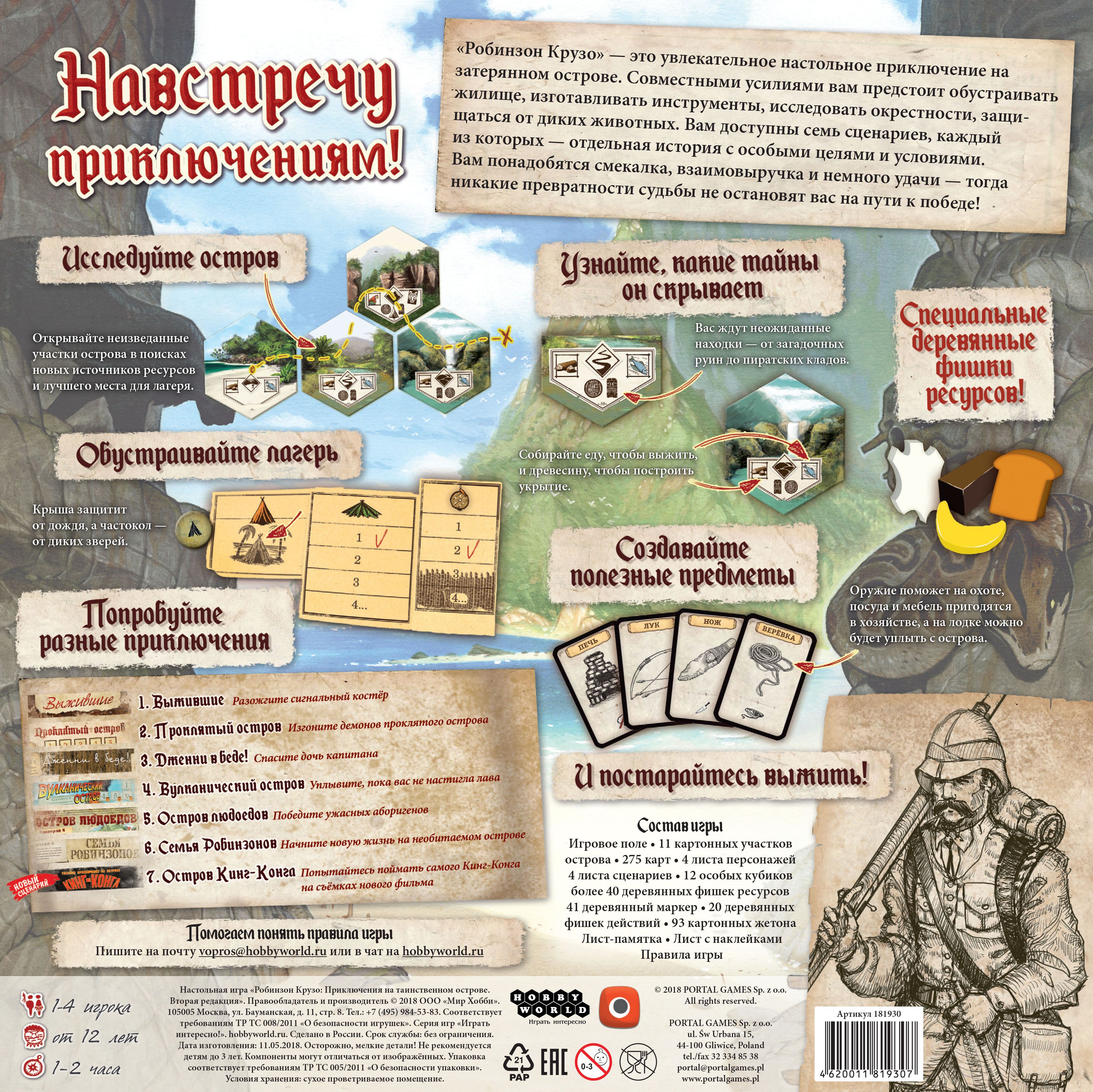 "Робинзон Крузо: Приключения на таинственном острове. Вторая редакция" – это кооперативная настольная игра, в которой одному игроку или команде до четырёх человек предстоит превозмогать тяжести жизни на необитаемом острове, всеми силами выживать, разгадывать тайны и пройти все семь сценариев, каждый из которых предложит уникальный игровой процесс. Сценарии можно объединить в большое приключение-кампанию, тогда ваше путешествие в мир игры станет ещё увлекательнее!