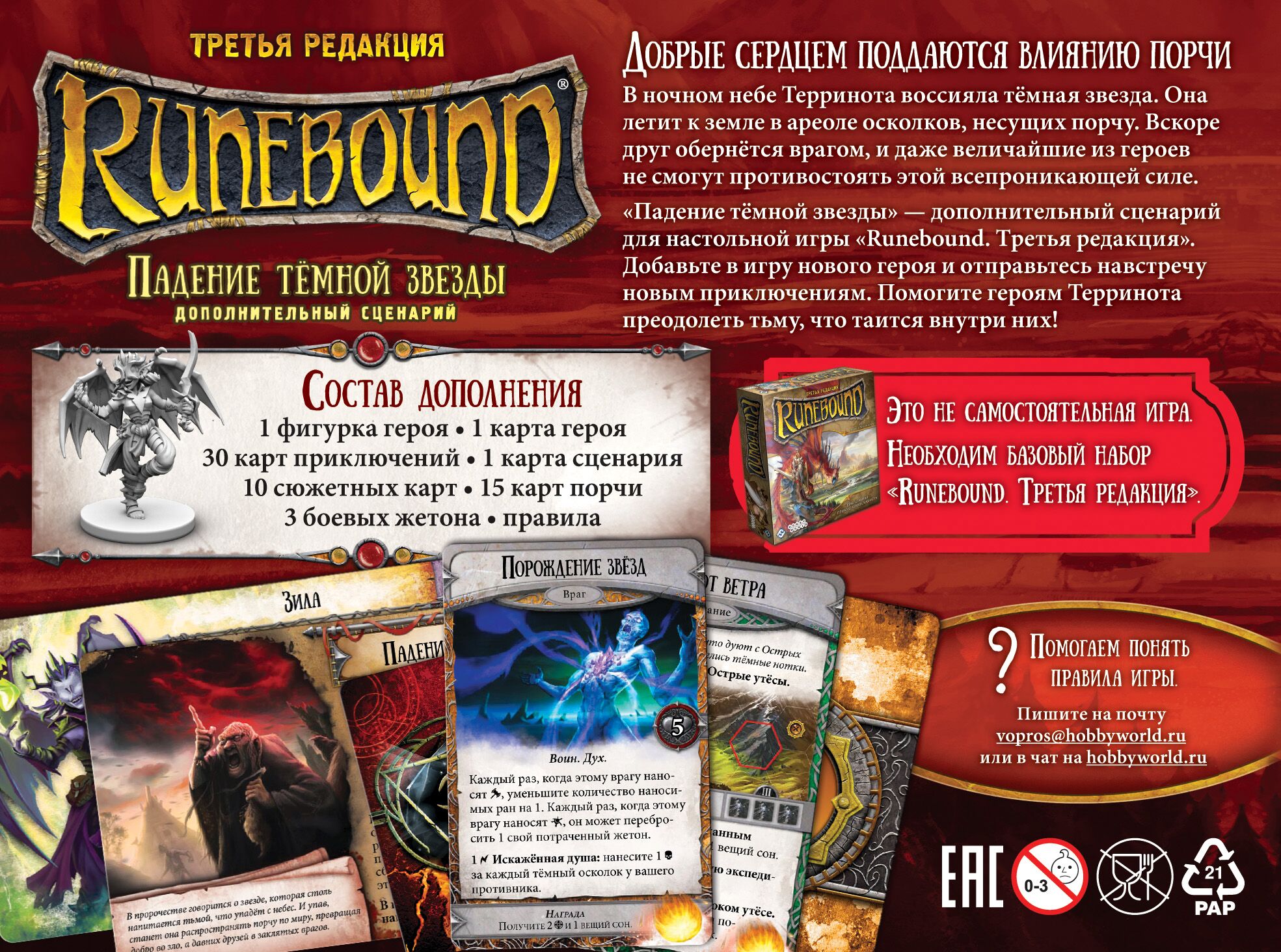 Пришла пора разнообразить привычные партии Runebound! Пророчество вот-вот сбудется. Темные осколки падают с небес, и миру Терринота грозит новая опасность. Удастся ли героям побороть ее? Как и другие наборы сценариев, "Падение темной звезды" предоставит совершенно новое приключение, предлагая игрокам отправиться навстречу новым опасностям и новым наградам. И куда же без нового героя, Зилы, обладающей потустронними силами. Тридцать новых карт приключений подарят незабываемые эмоции всем храбрым героям! *Это не самостоятельная игра. Необходим базовый набор "Runebound. Третья редакция".
