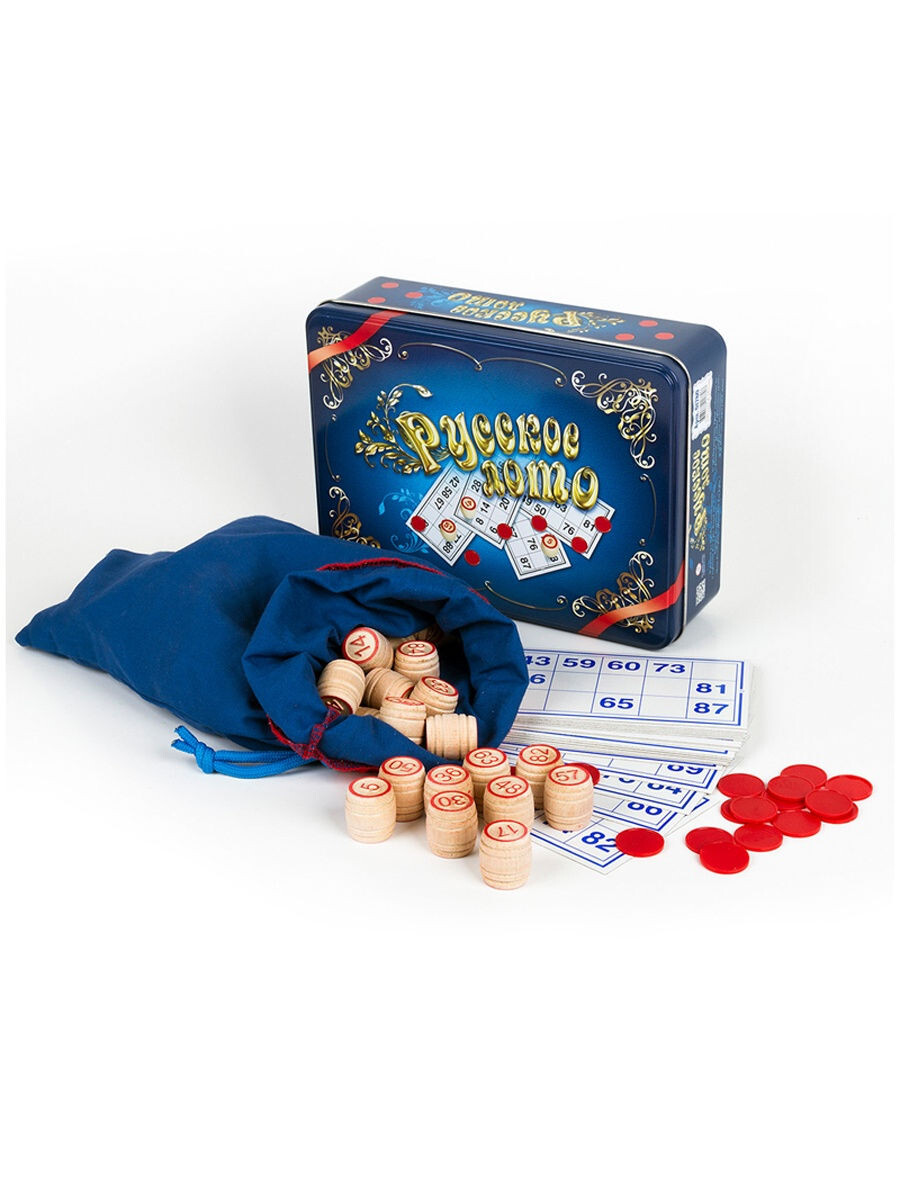 Данный вариант лото содержит деревянные бочонки, пластиковые фишки для закрытия чисел и картонные карточки. Все элементы упакованы в прочную жестяную коробку, которая обеспечит должную безопасность.