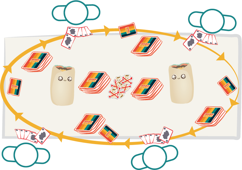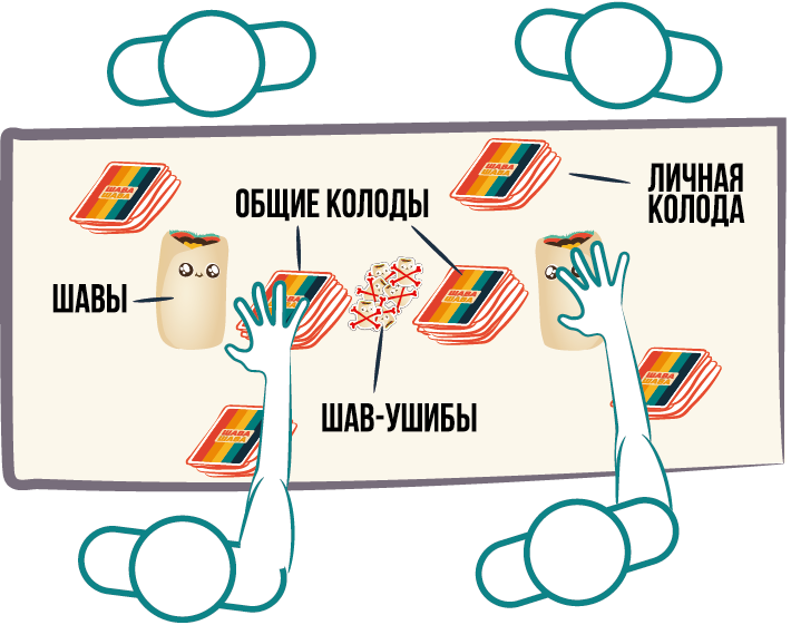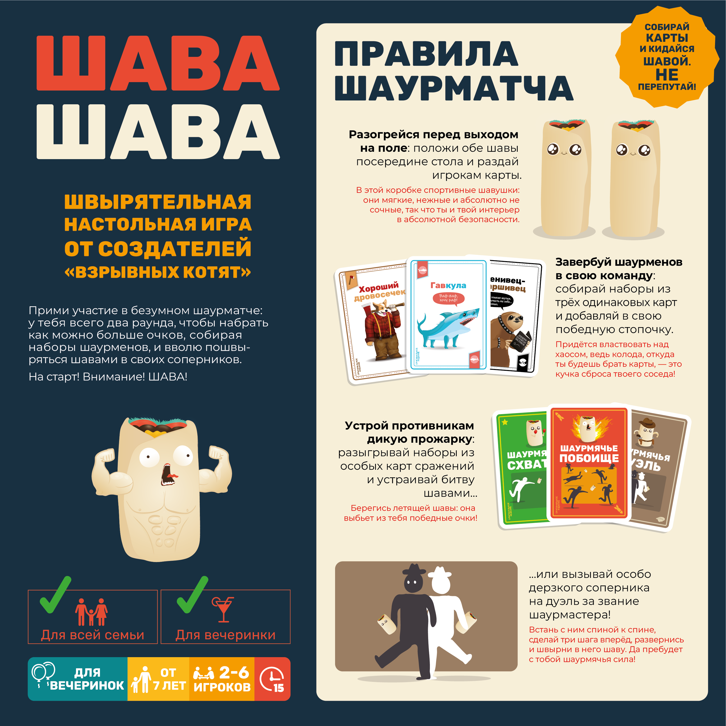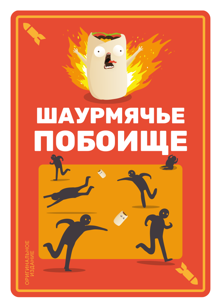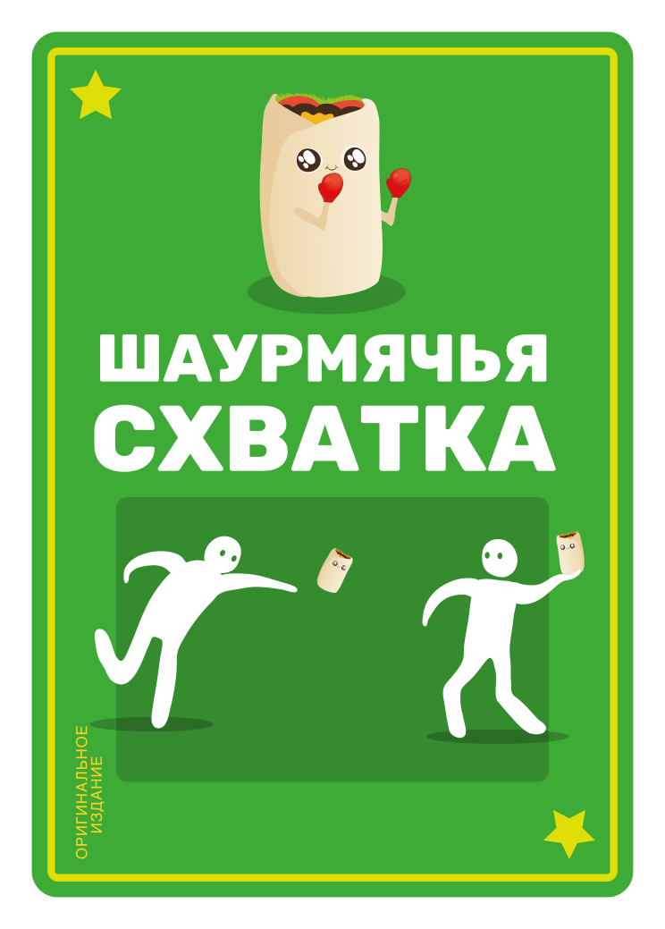 Кто сможет стать лучшим? Доставайте карты из коробки и выясните это! Выкладывая по одной карте, игроки стараются собрать набор из нескольких карт для получения победных очков. При этом, в центре стола лежат мягкие искусственные шаурмы, которые ждут своего звездного часа. Если из колоды лежащих в закрытую карт выпадет карта противостояния, один из участников должен будет схватить шаурму и метнуть ее в противника. Если он попадет, получит специальный жетон, который скажется на его победе. Попробуйте не попасть под раздачу, собрать лучший набор карт и стать победителем в этой ожесточенной схватке!