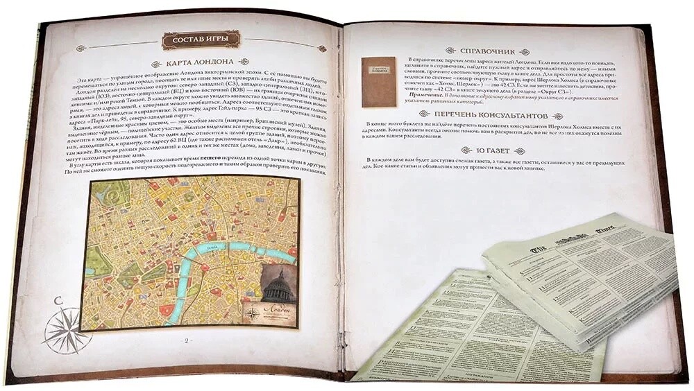 Карта Лондона3 дополнительные карты10 книг дел10 газетКонверт с 12 уликамиСправочник ЛондонаПравила игры