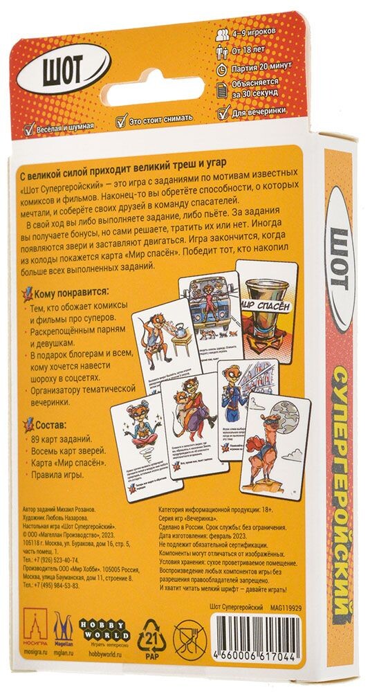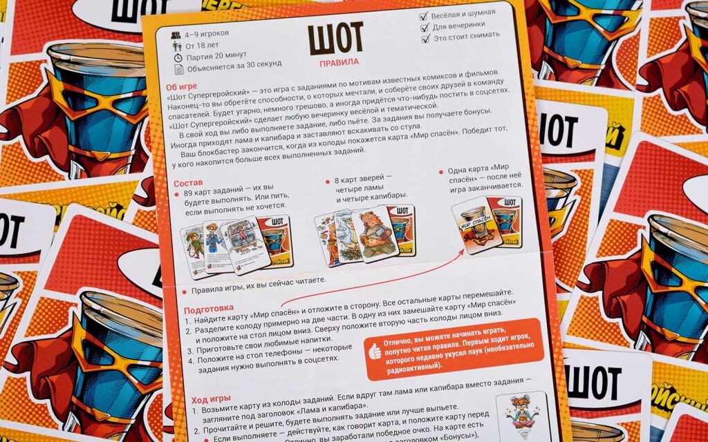 Новый выпуск веселой викторины предложит игрокам задания, основанные на комиксах и фильмах с могучими героями, побеждающими злодеев. В свой ход участники должны выполнить задание, а если по какой-либо причине они этого сделать не могут, тогда нужно будет выпить. Помимо обычных карт в игре присутствуют и карты с животными, которые можно неожиданно разыграть, подловив других игроков и таким образом выписать им штраф. Как только в колоде попадется специальная карта, игра завершится, и тогда участникам предстоит подсчитать победные очки. Кто выполнил наибольшее количество заданий, тот и победит! Надевайте трико, берите рюмку в руки и покажите, кто здесь лучший!