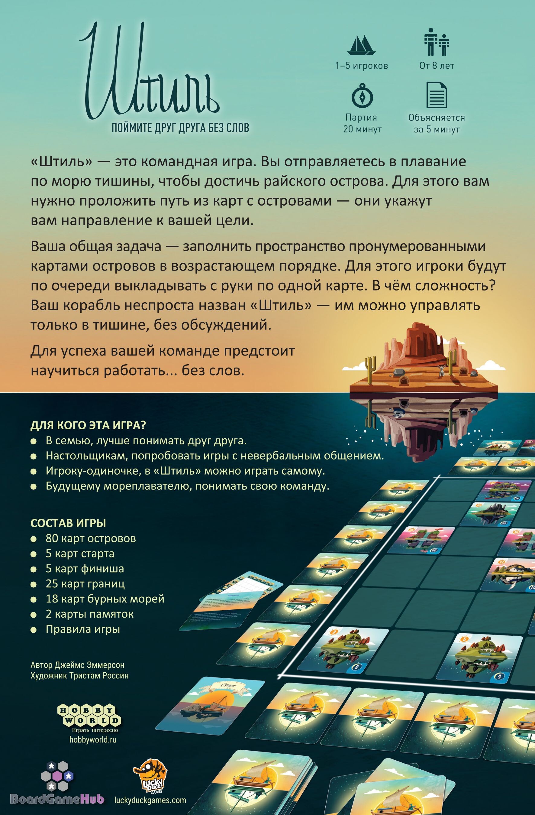 Необычное кооперативное приключение! Запрыгивайте на летающий корабль и постарайтесь найти дорогу домой! Игрокам предстоит с помощью карт заполнить море островами по номерам и направить корабль домой до того, как у любого участника закончатся карты. Есть только одна загвоздка - игроки никак не могут переговариваться между собой и координировать свои действия, ведь партия проходит молча. Острова должны быть выложены по номерам от меньшего к большему, и в свой ход вы можете сыграть карту, сбросить ее, либо добрать несколько, чтобы на руках было пять карт. Сможете ли вы справиться с непростой задачей и найти путь домой? Действуйте сообща и постарайтесь понять друг друга без слов!
