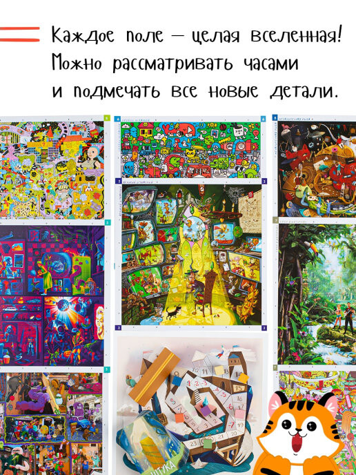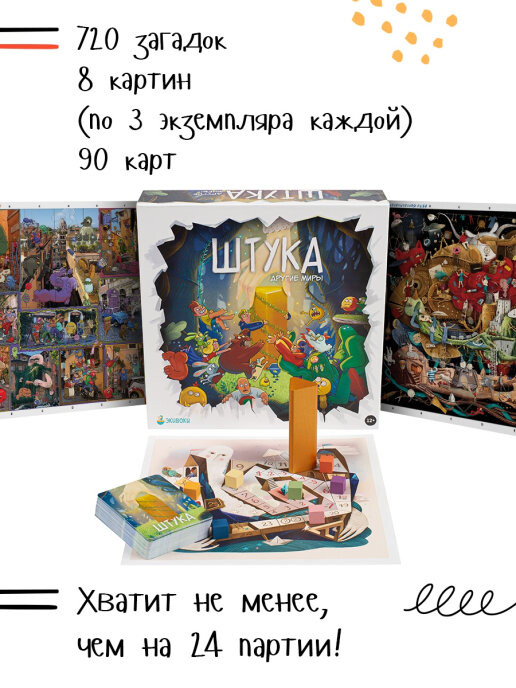 Принцип прост - игроки по очереди получают карты с загаданным словом. Слово можно объяснить одним из нескольких способов - к примеру, нарисовать. Ключевое отличие данной викторины от аналогов - загаданное слово нужно не просто назвать, а найти его на большом планшете со множеством иллюстраций. Кто сделает это первым, и не ошибившись, продвинется по полю ближе к победе!