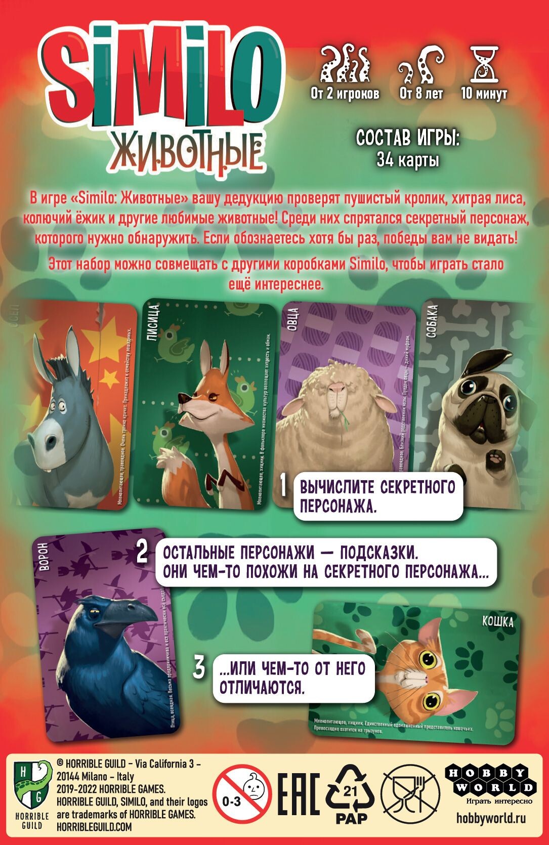 Новый выпуск красочной викторины на угадывание познакомит игроков с различными лесными жителями. Выложив двенадцать карт на стол, один из игроков загадает персонажа, после чего начнет давать другим участникам подсказки, вытаскивая новые карты из колоды. Если у выложенной карты есть что-то общее, он положит подсказку вертикально, а если есть различия, - то горизонтально. Игроки могут совещаться, и убирать со стола неподходящих, по их мнению, персонажей. Но если они уберут искомую карту, то сразу проиграют.