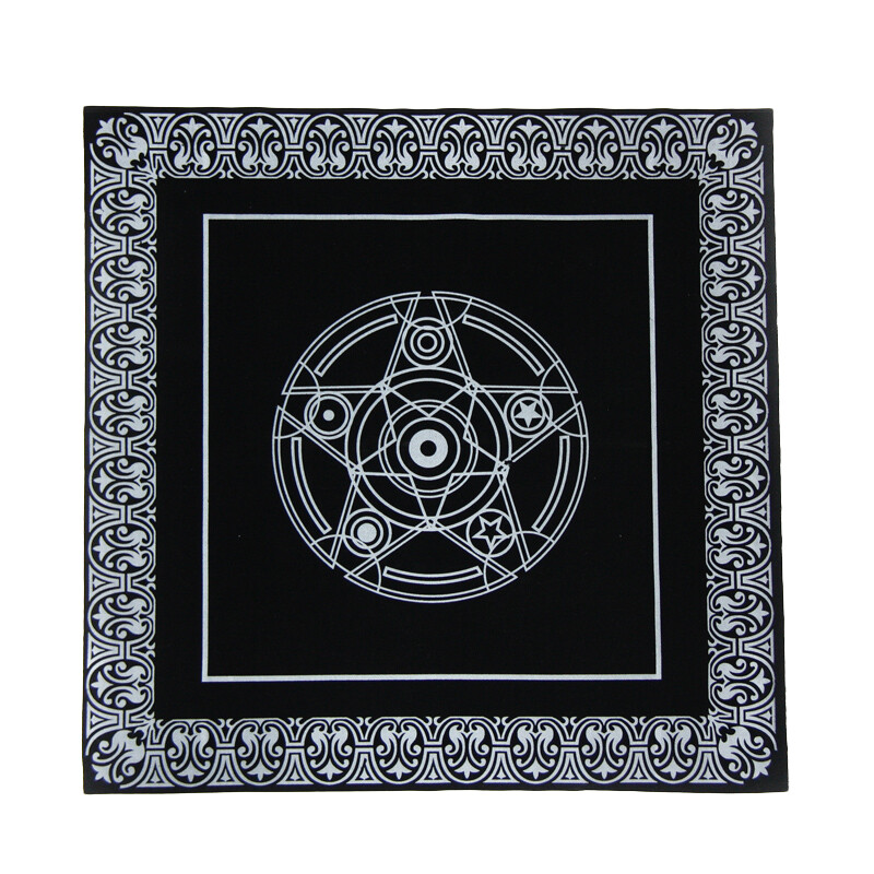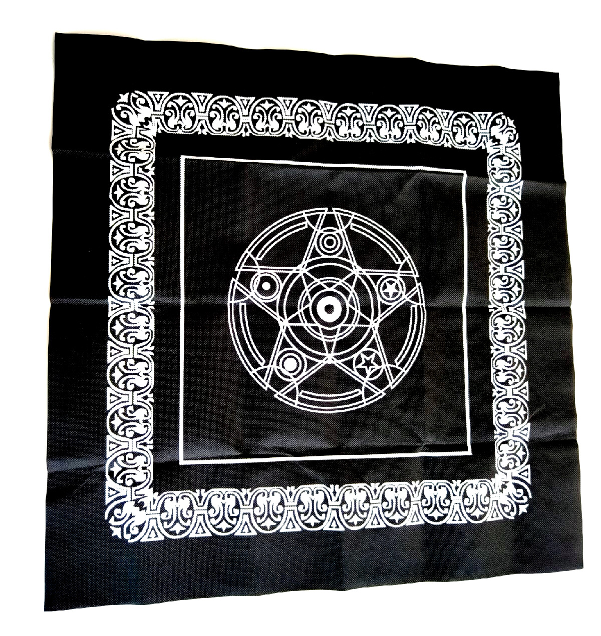 Перед вами скатерть из прочного темного материала, которая станет хорошим дополнением к раскладу карт Таро. Скатерть имеет размер 490x490мм и различные символы, нанесенные белым цветом.