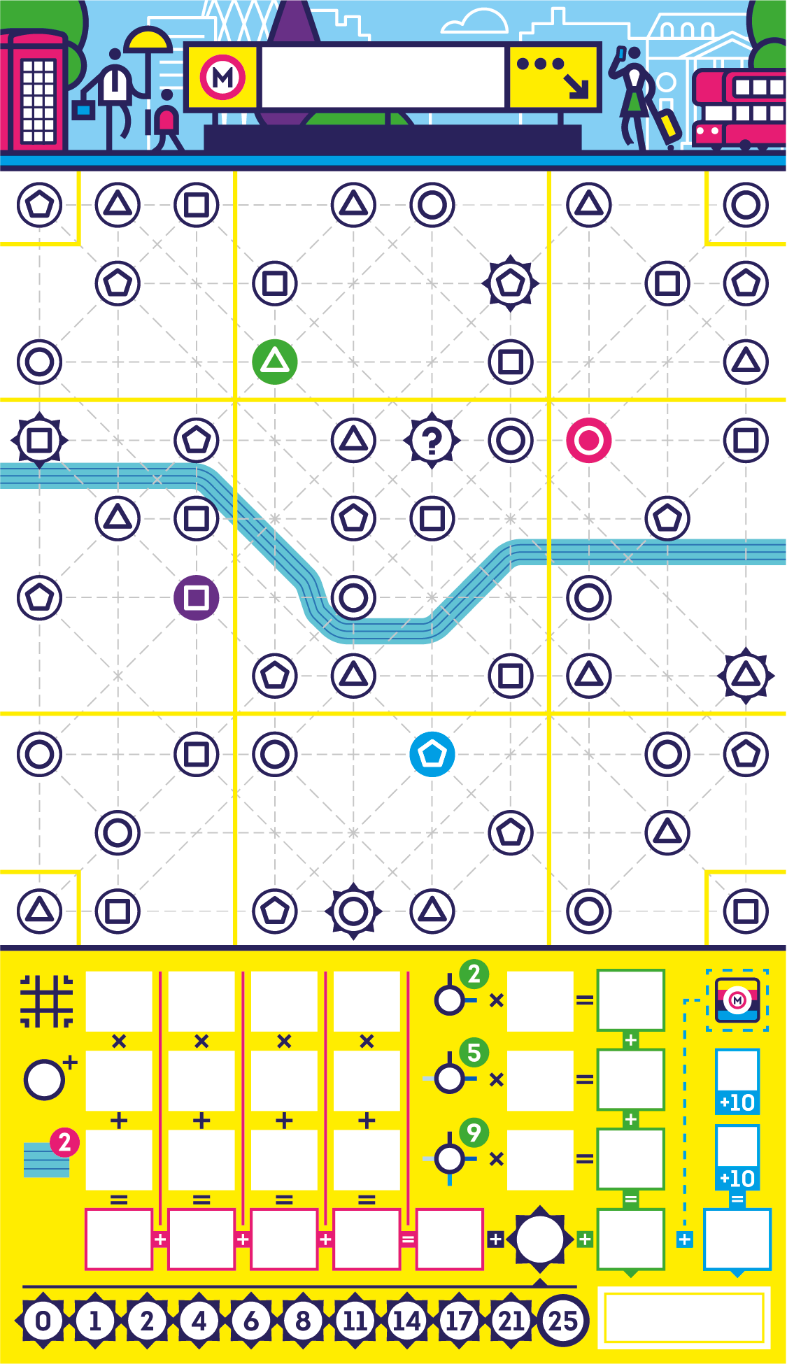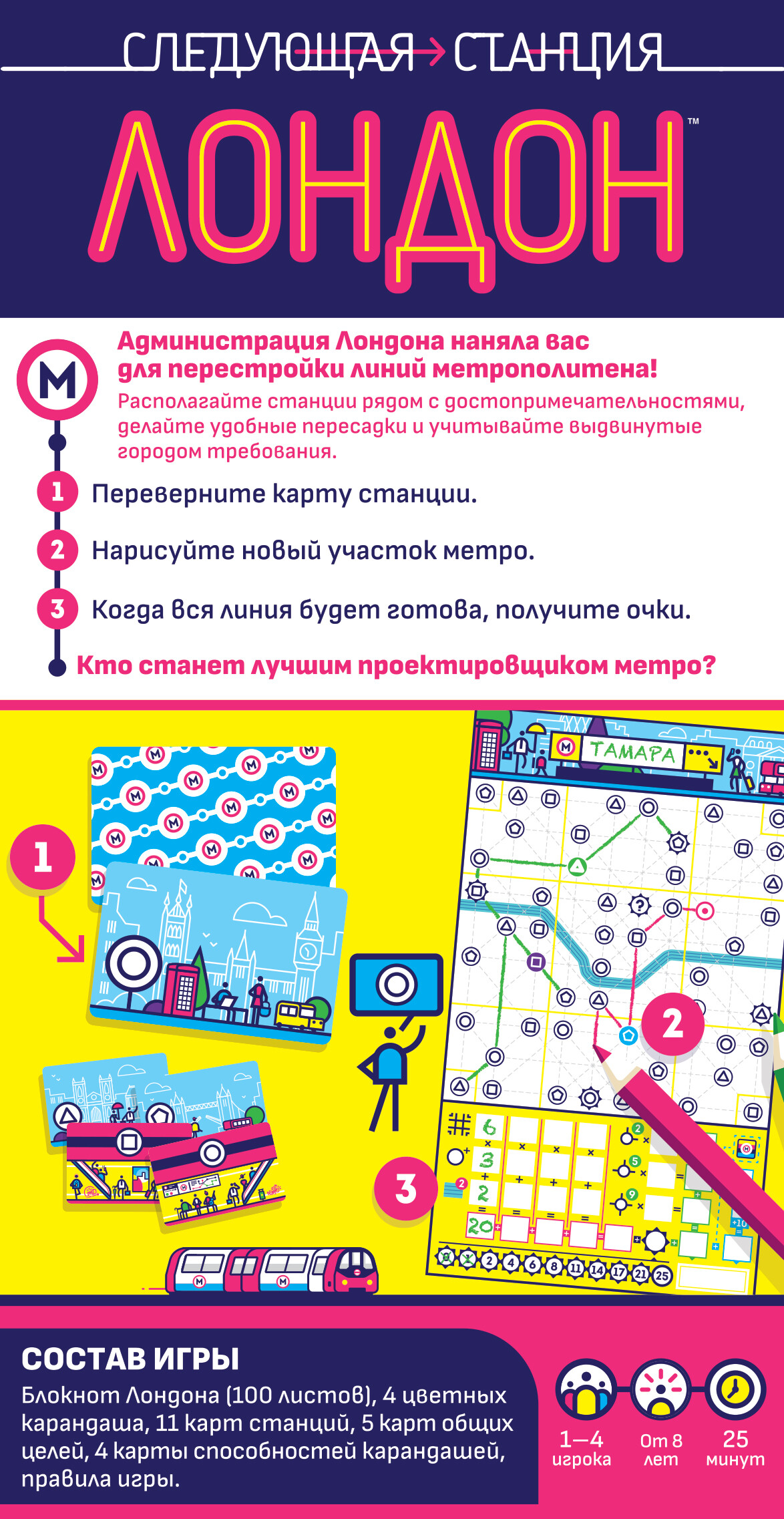 Кто создаст лучшую систему метро Лондона? В коробке вы найдете специальный набор полей с картой города и цветные карандаши, которыми предстоит прокладывать путь поездов за определенное количество ходов. Начинайте от стартовой станции и постарайтесь проложить лучшую ветку, создавая ее через достопримечательности и памятные места на карте, получая таким образом больше призовых очков. Постарайтесь не пересекать другие станции и максимально эффективно использовать свои ходы. Попробуйте командный режим, или сыграйте в одиночку. Кто станет лучшим проектировщиком?