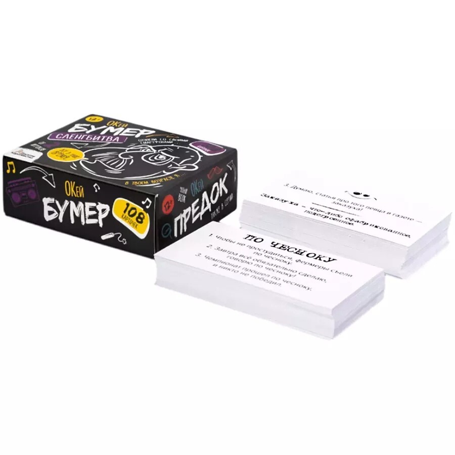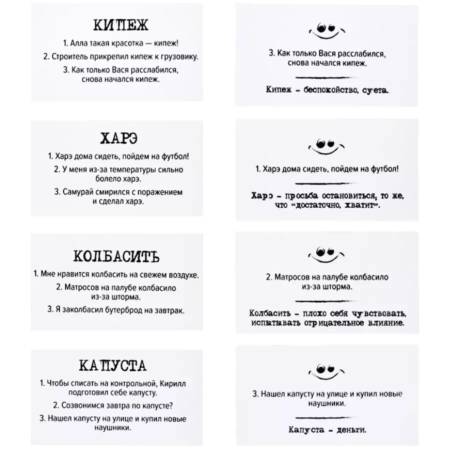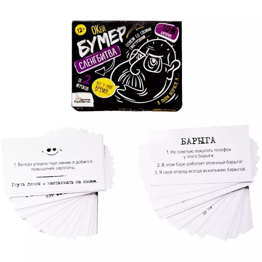Данная викторина предложит вам отгадать, какие значения имеют устаревшие слова, использующиеся в обиходе прошлого поколения. На каждой карте из коробки вы найдете само слово, а также три варианта его значения. На обратной стороне карты будет указан правильный ответ, и прежде чем посмотреть на него, вам нужно будет выбрать один из трех возможных. Проверьте себя и попробуйте угадать как можно больше значений, ведь тогда вы станете победителем!