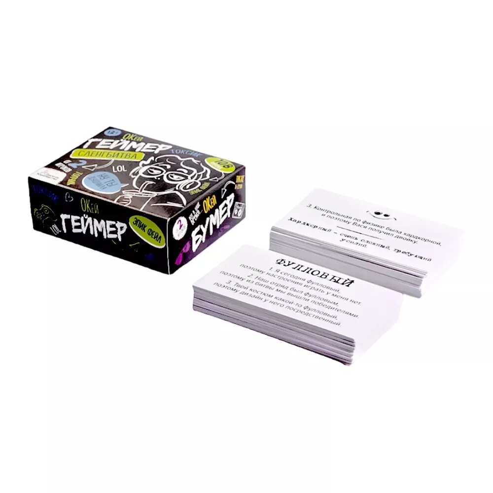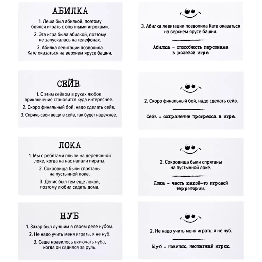 В коробке вас ждет множество карт с различными словами, которые используются среди людей, предпочитающих видеоигры. Помимо слова, на каждой карте будет три варианта его значения, а на обратной стороне правильный ответ. Каждый из участников по очереди тянет карту, зачитывает ее содержимое и выбирает один из вариантов, а затем проверяет себя. Тот из игроков, кто наберет таким образом наибольшее количество правильных ответов, станет победителем!