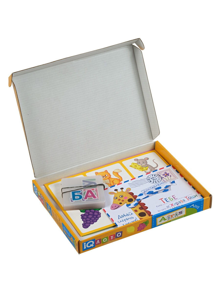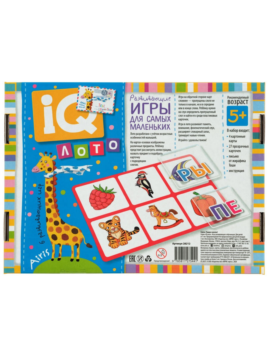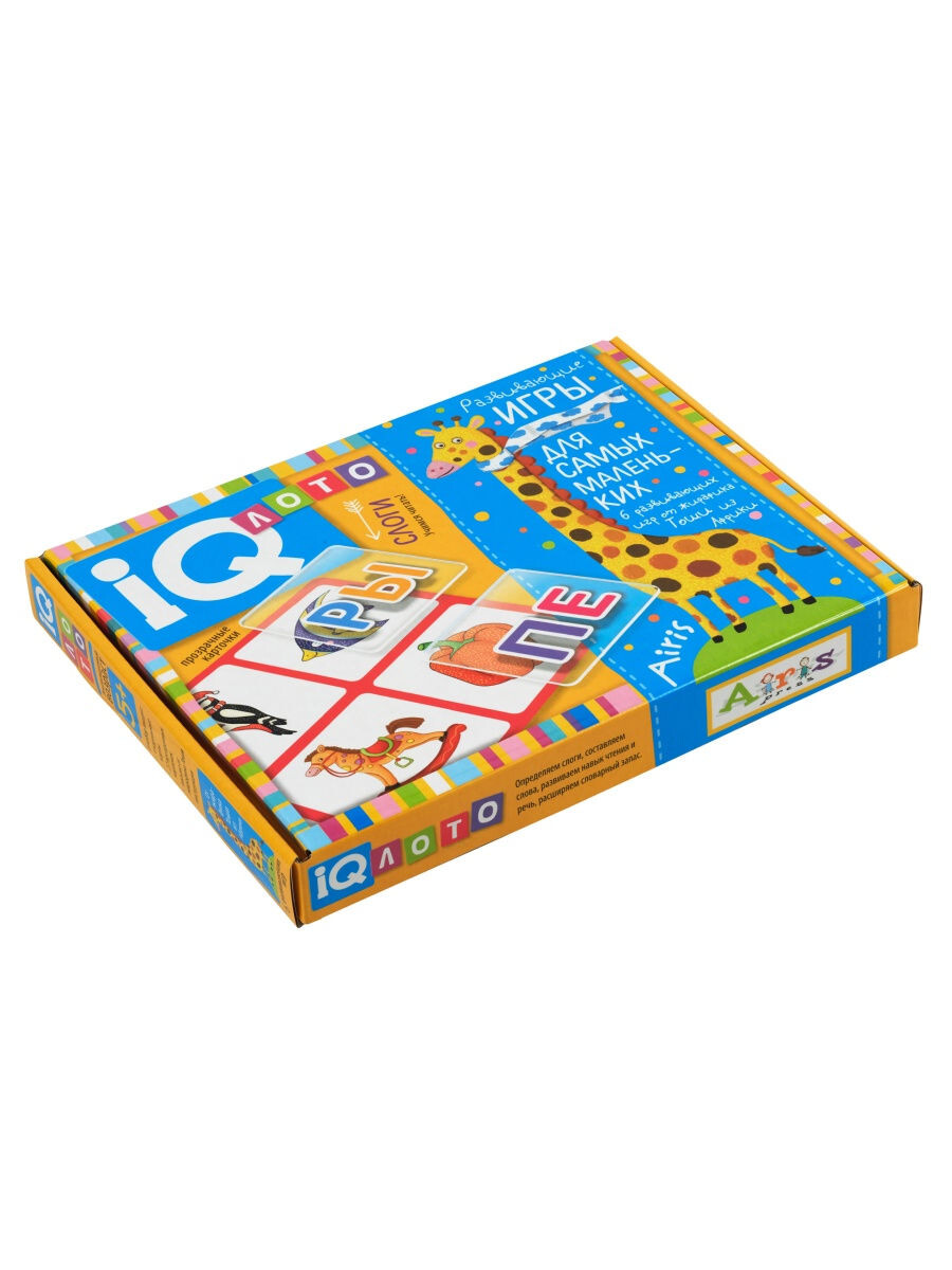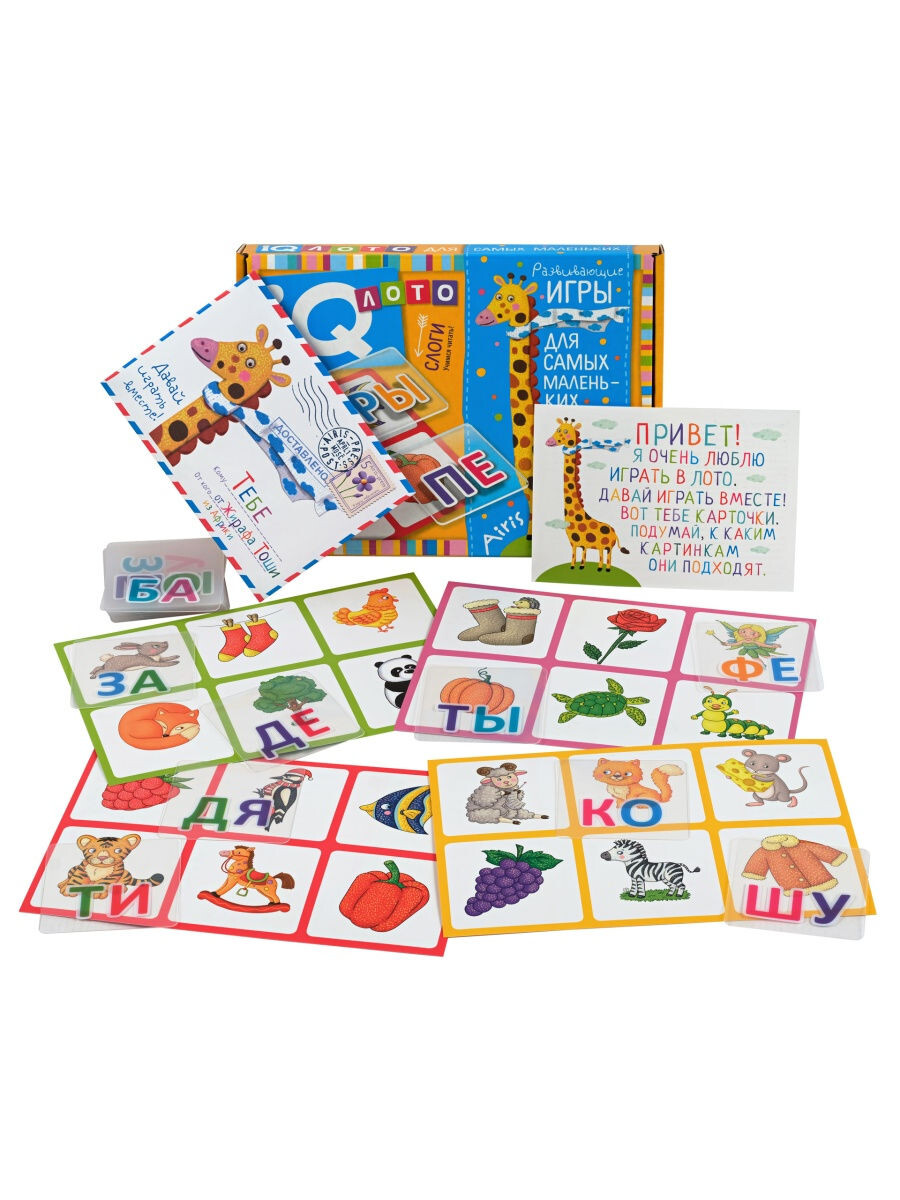 Перед вами вариация классичекого лото, которая поможет ребенку развить память и словарный запас, а также обучиться азам чтения. На картах вы найдете множество нарисованных предметов, которые игроку необходимо произнести, после чего подобрать карту с подходящим слогом. Внутри коробки родители найдут инструкцию по игре, а ребенка будет ждать веселое напутствие от жирафика.