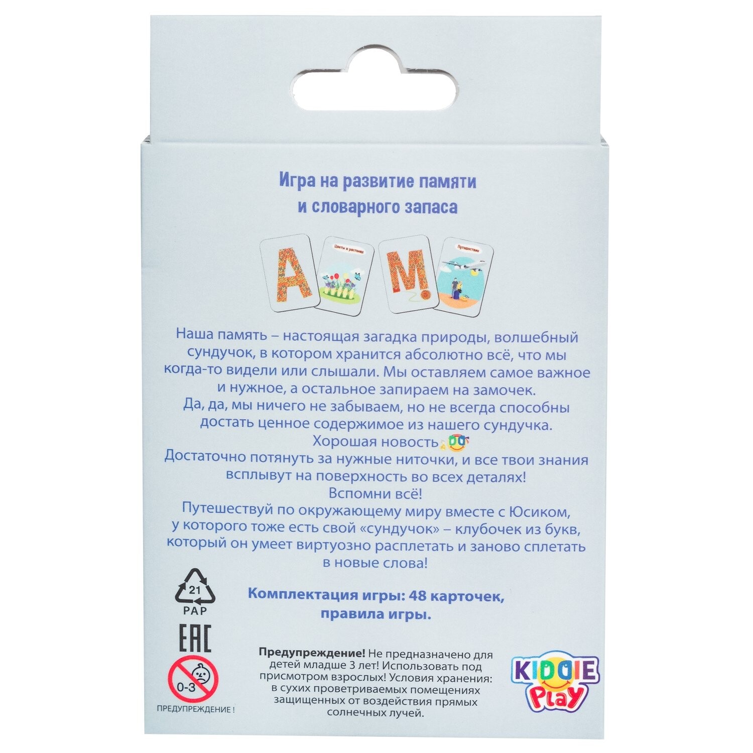 Участникам предстоит быстро вспоминать слова на выпавшую карту-тему. Задача усложняется тем, что слова должны начинаться строго с определенной буквы. Первый игрок, кто назовет такое слово, забирает карту с темой себе. Кто сможет раньше остальных собрать три карты, тот станет победителем!