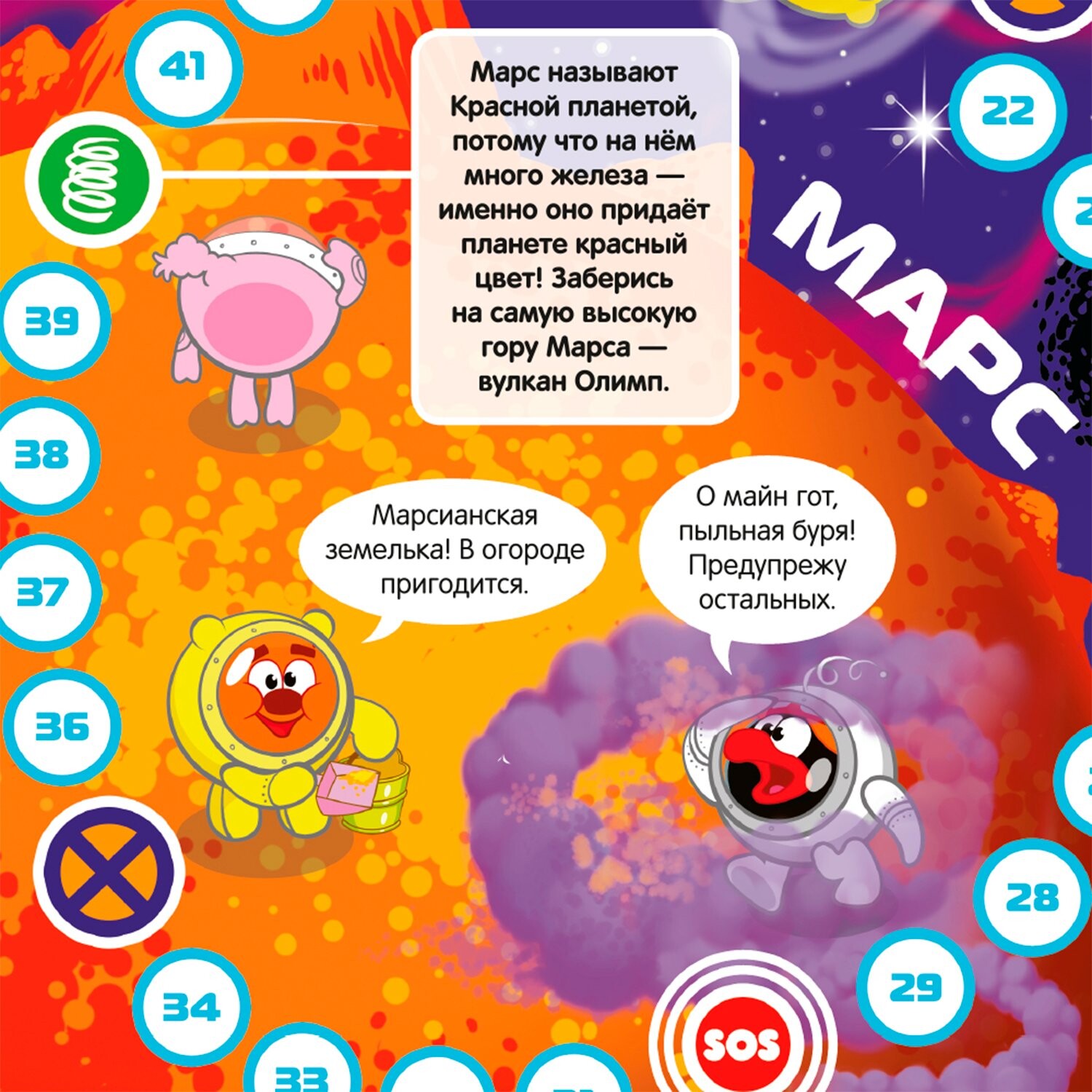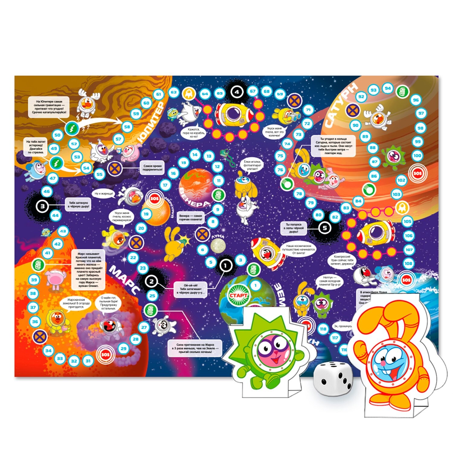 Данная настольная игра предложит вам добраться до финиша раньше остальных игроков. На большом красочном поле вас ждут любимые герои знаменитого мультсериала, которые с радостью поведают вам интересные факты о планетах Солнечной системы. Бросайте кубик, перемещайте картонные фигурки по кружкам поля, нахождение на которых может дать вам преимущество, или же, наоборот, замедлить. Узнайте много нового о планетах и станьте победителем!