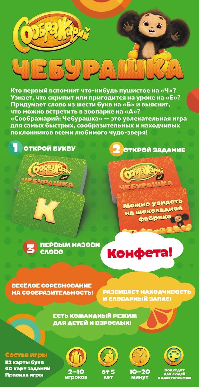 В коробке вы найдете две колоды карт, на одной из которых вас ждут различные вопросы, а на другой буквы. Вытянув по одной карте из каждой колоды, участники должны назвать ответ на определенную букву. Данный выпуск из знаменитой настольной серии имеет иллюстрации с любимым героем детства, и на картах вы найдете изображение Чебурашки и мандаринов. Кто сможет дать наибольшее количество правильных ответов, тот и победит!