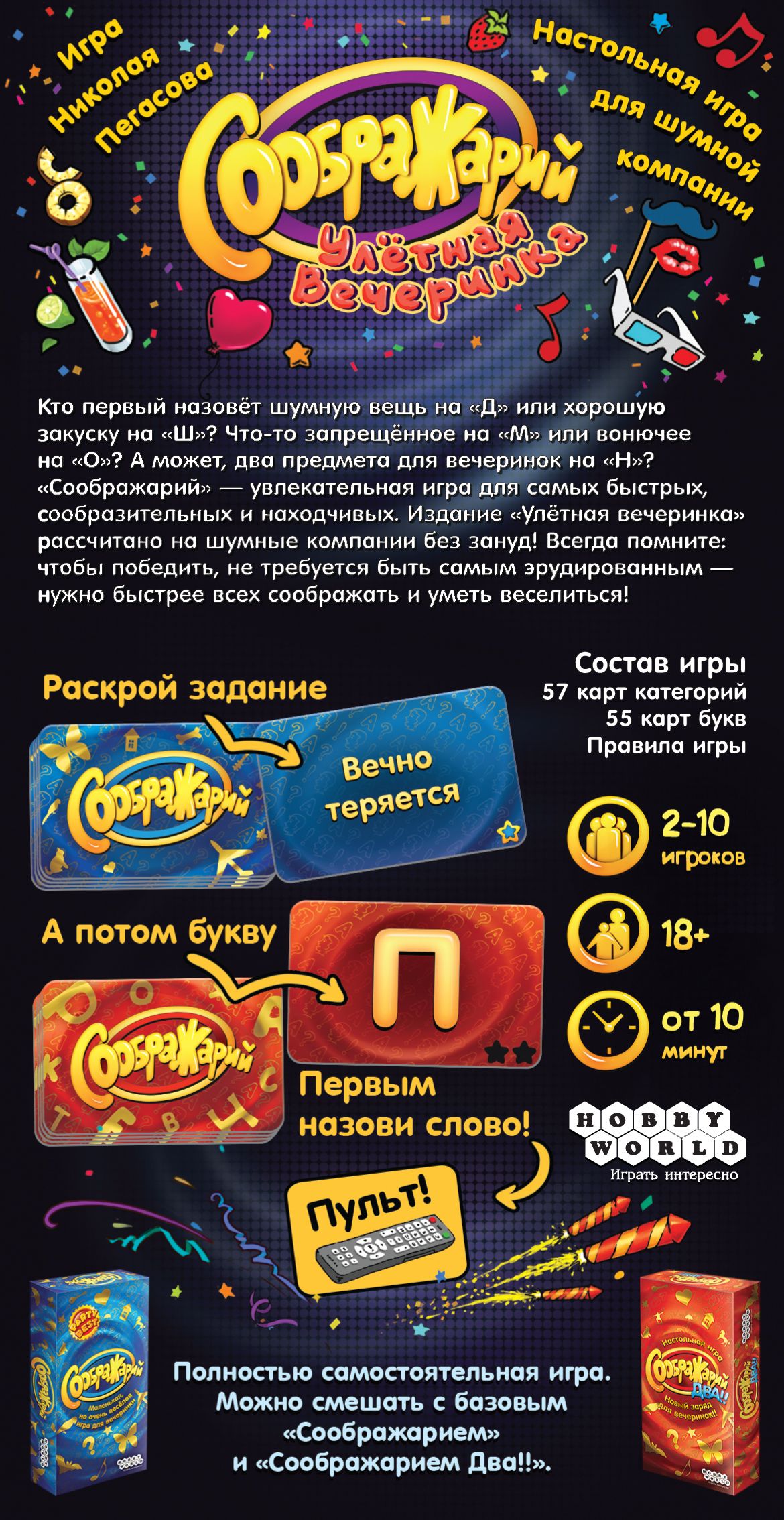 В данной настольной игре вас ждут карточки с вопросами и карточки с буквами. Приготовьтесь к тому, что определенные вопросы будут на взрослые откровенные темы, но далеко не все, и при желании, исключив некоторые карты, вы можете играть и с детьми. Выложив карты в две стопки взакрытую, участники одновременно открывают по одной карте из каждой колоды. После этого надо быстро дать ответ на вопрос, причем ответ должен начинаться с открытой буквы. Тот, кто сделает это раньше остальных, получит карту с вопросом себе. Игрок, набравший наибольшее количество призовых очков, станет победителем!