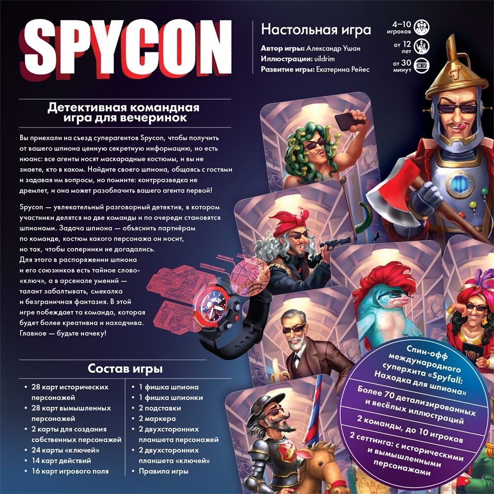 Чудеса дедукции и впечатляющий талант к общению - вот что предстоит продемонстрировать вам в настольной игре Spycon! Поделившись на команды, игроки стараются вычислить в группе людей свой источник, но все носят костюмы, и вы не знаете, кто ваш связной. Найдите своего шпиона, послушав и поговорив с посетителями, но вы должны помнить, что вторая команда не ждет и может найти шпиона раньше! Цель шпиона - заставить свою команду угадать, в какой костюм он одет, таким образом, чтобы противостоящая команда его не поняла. Для этого шпион и его команда используют специальное ключевое слово, а также сообразительность и безграничную фантазию. Победит самый креативный и изобретательный!