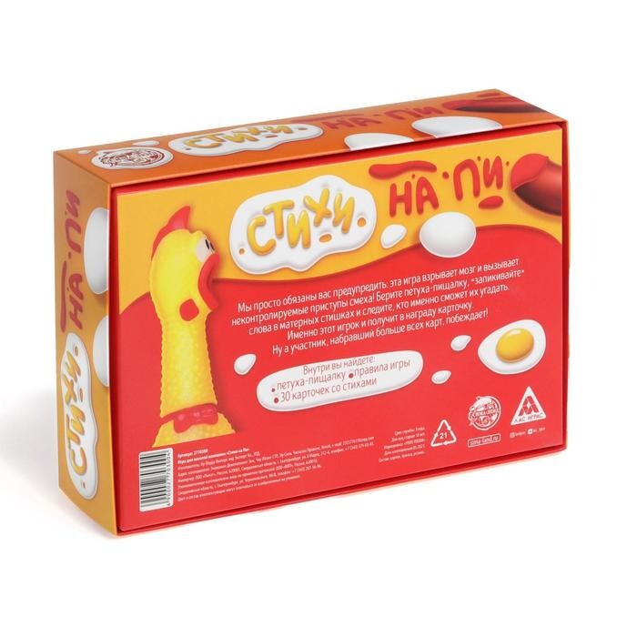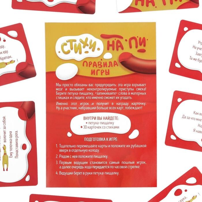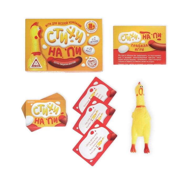 Готовы посоревноваться в знании неприличных слов? Один из игроков берет карту с текстом и зачитывает его. В места пропусков нужно вставлять пищание резинового петуха, который идет в комплекте. Дочитав, он передает свой ход другим участникам, которым, в свою очередь, нужно догадаться, что было на месте пропусков. Сквернословия будет много, поэтому готовьтесь хорошенько повеселиться!