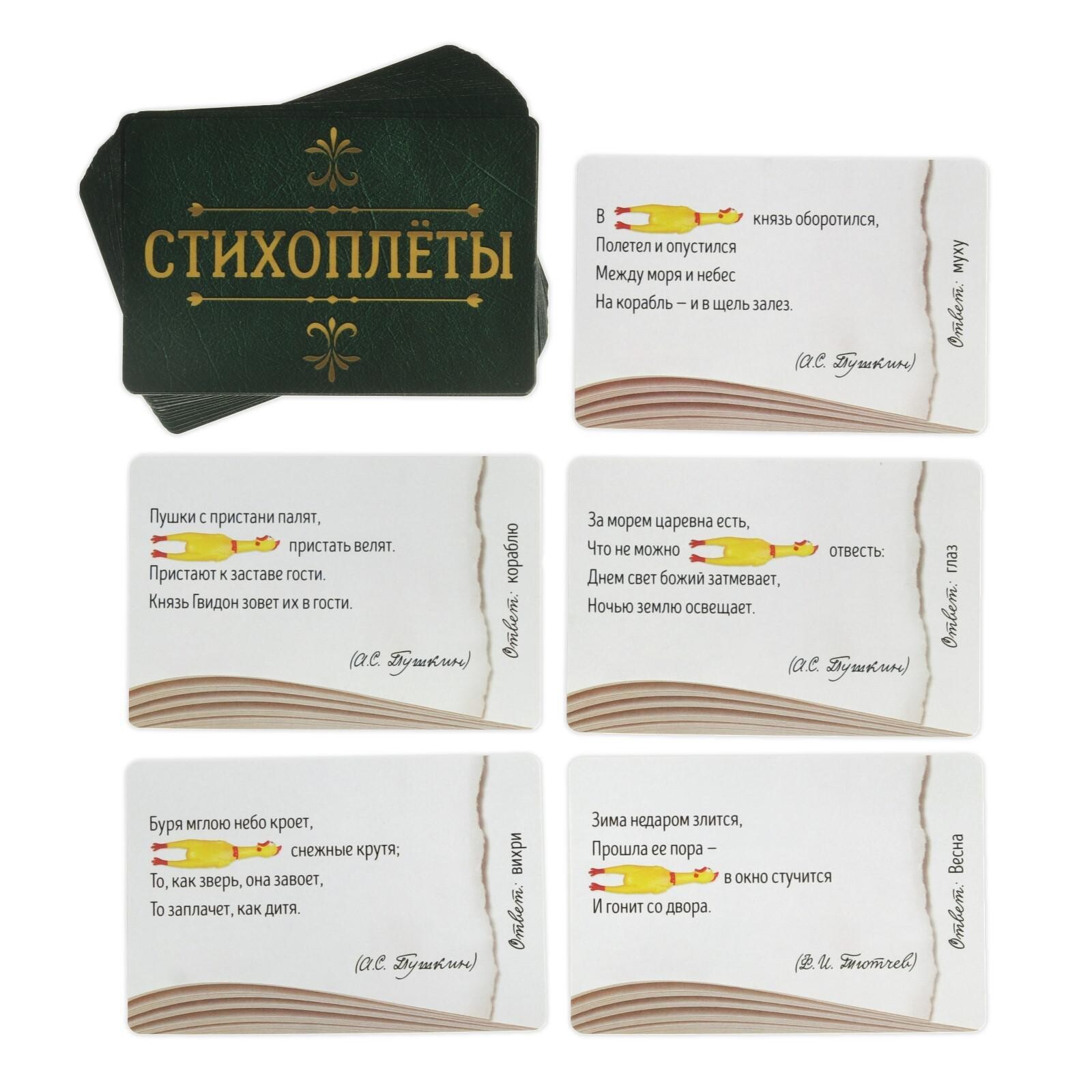 В данной игре вы найдете множество карточек с фрагментами знаменитых стихов, а также специальную игрушку-пищалку. Вам предстоит зачитывать другим игрокам стих, но некоторые слова запикивать игрушкой. Тот из игроков, кто правильно вспомнит пропущенное слово, получит карту себе. Победит игрок, набравший наибольшее количество карт. Проверьте свои знания поэзии весело и соревновательно!