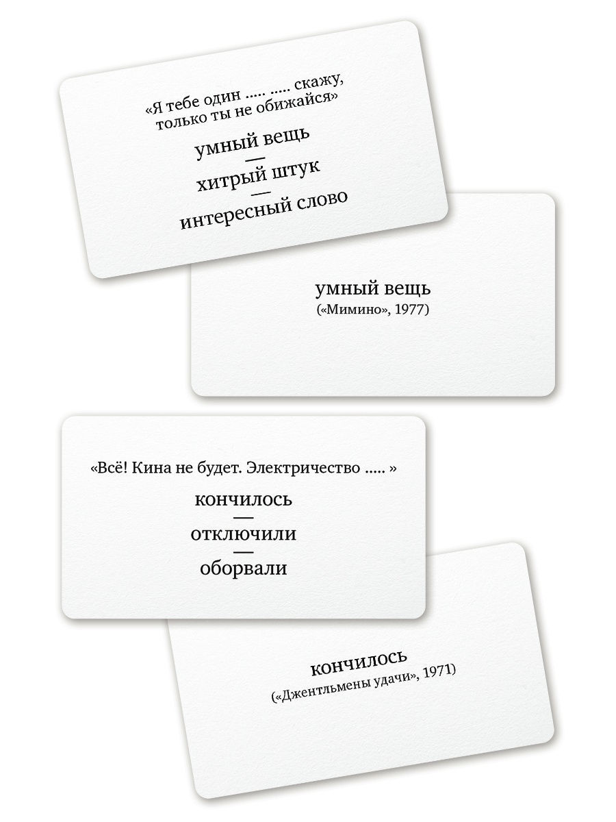 Собирайтесь за одним столом и устройте веселую викторину! В коробке вы найдете множество карточек с цитатами из известных фильмов. Дело в том, что цитата приведена не полностью, и, чтобы ее закончить, вам надо выбрать один из трех вариантов, указанных на каждой карте. Кто отгадает правильно, тот получит победные очки. Игрок, набравший наибольшее количество правильных ответов, станет победителем!