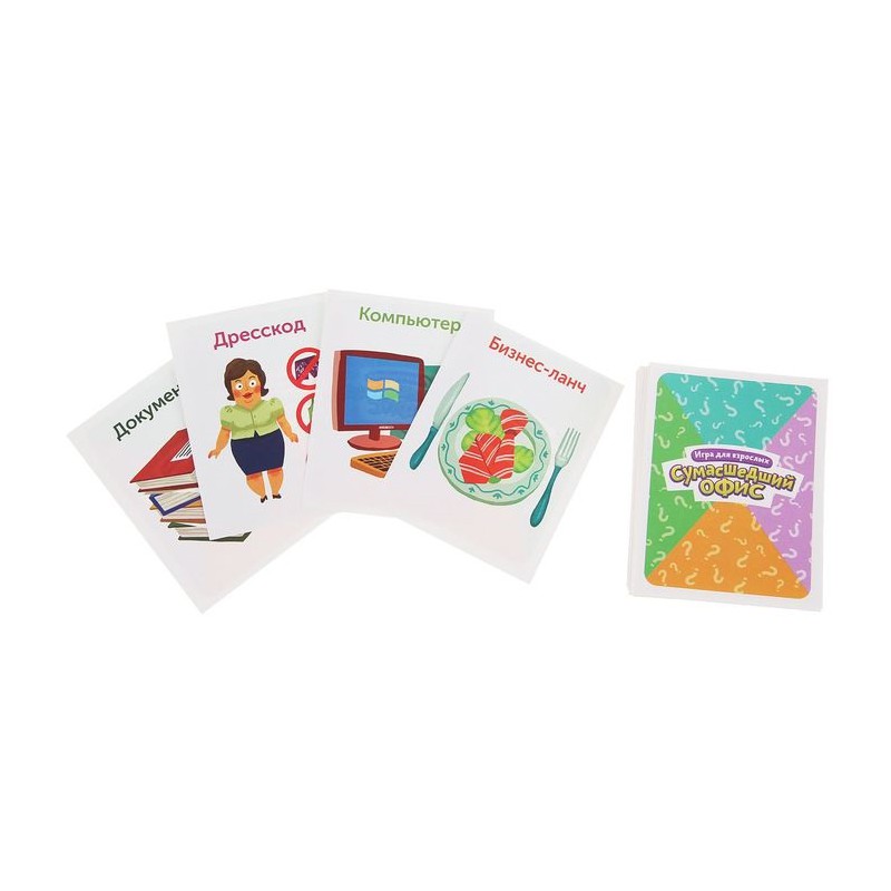 Работа в офисе часто бывает весьма рутинной, и даже обеденный перерыв не приносит счастья и отдыха. Пора это исправить! В данной настольной игре участникам предстоит отгадывать персонажей и предметы, находящиеся в офисном помещении. Каждый получает специальный обруч на голову, куда крепится карта рисунком к остальным игрокам. За минуту (песочные часы в комплекте), вам надо отгадать, являетесь ли вы клавиатурой, или бухгалтершой в декрете. Не успели? Ход переходит другому игроку. Кто отгадает больше, тот и победит!