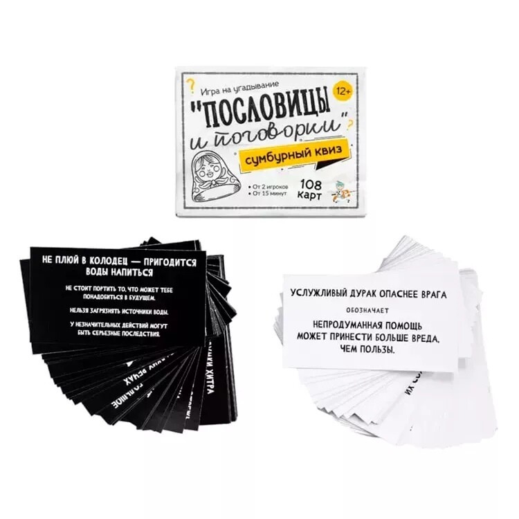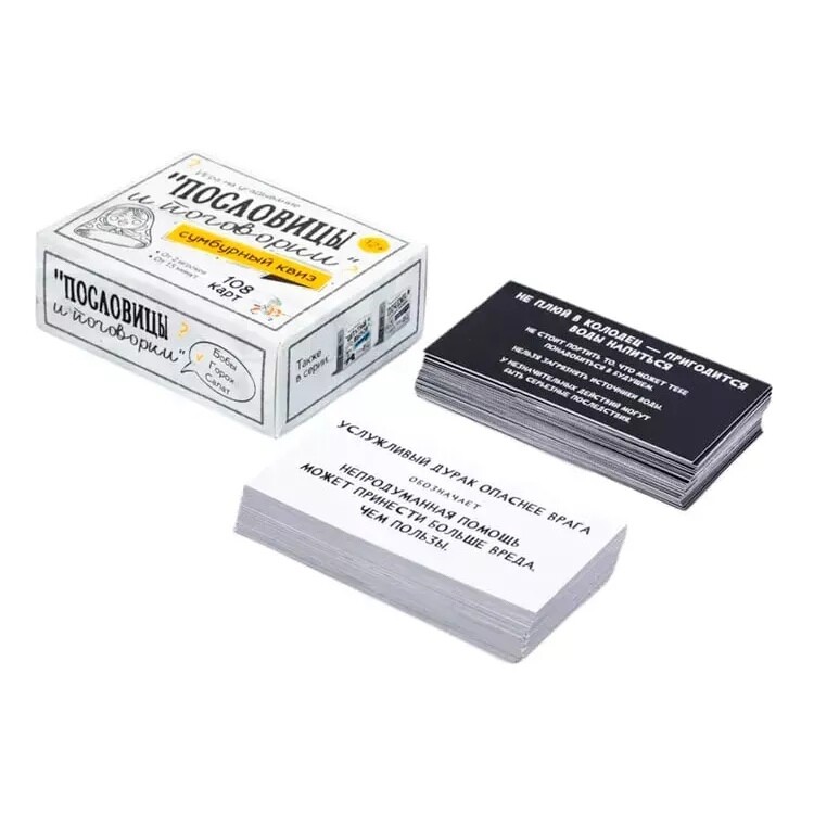 В коробке вы найдете множество карт, на которых указаны пословицы, и три варианта их значения. Прочитайте пословицу и выберите один из трех вариантов, после чего переверните карту. На обратной стороне вы найдете правильный ответ. Он совпал с вашим? Тогда вы станете ближе к победе. Дайте наибольшее количество правильных ответов и станьте победителем!
