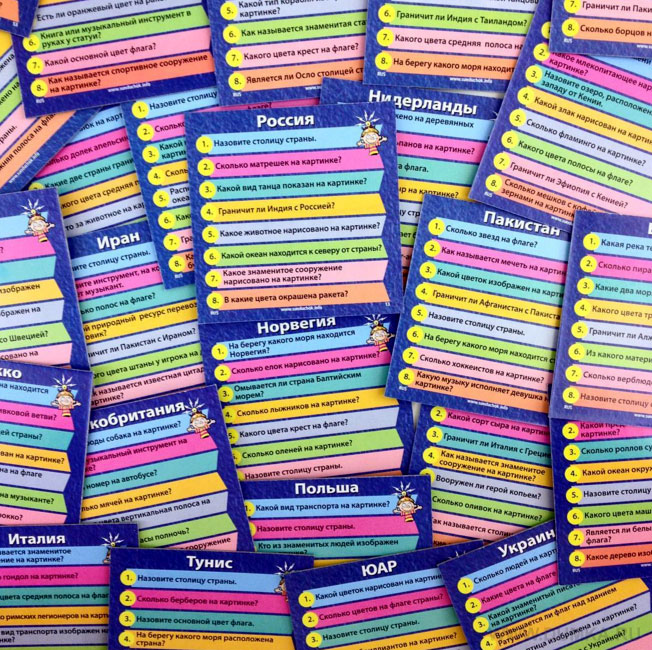 Наш мир разнообразен и неповторим. Каждая страна и каждый народ отличаются своими обычаями и традициями, и изучать их невероятно интересно! А в игровой форме узнавать что-то новое интересно вдвойне! В игре представлена 71 страна. Особенности каждой страны представлены в её карточке. Тут Вы найдёте много интересного: флаг страны и название столицы, известные достопримечательности, культура её народов и другое. Изучая карточки будьте очень внимательны и очень быстры, ведь на изучение всех фактов у Вас есть всего десять секунд! Как только песчинки в специальных часах закончатся, игроки должны перевернуть карточку, бросить специальный кубик и ответить на вопрос под соответствующим номером! Отправьтесь в виртуальное путешествие по нашей планете!