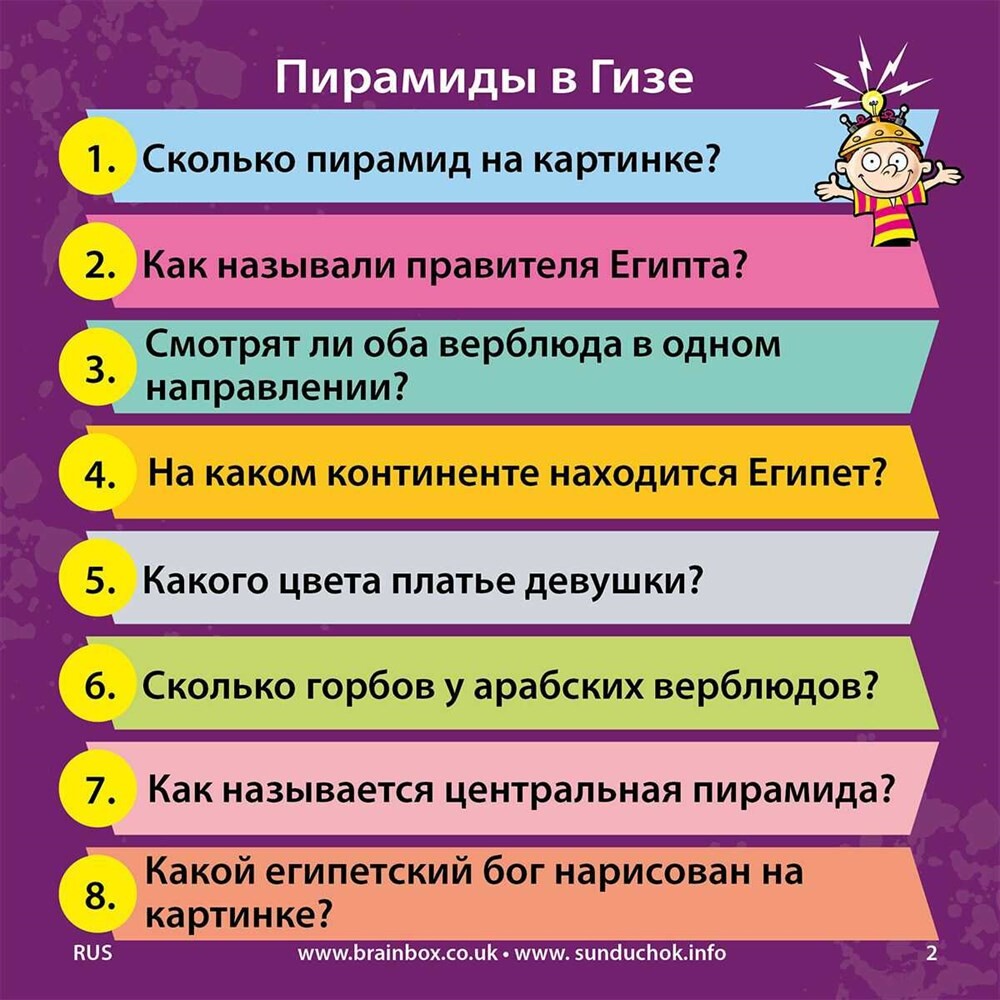 В коробке вы найдете множество карт с историческими фактами из разных уголков света. Картинки и описания игрок, вытянувший карту, должен постараться запомнить за короткий промежуток времени. После этого другой игрок задает участнику вопросы по увиденному. Кто сможет дать наибольшее количество правильных ответов? Запоминайте, узнавайте и развивайте свои знания!