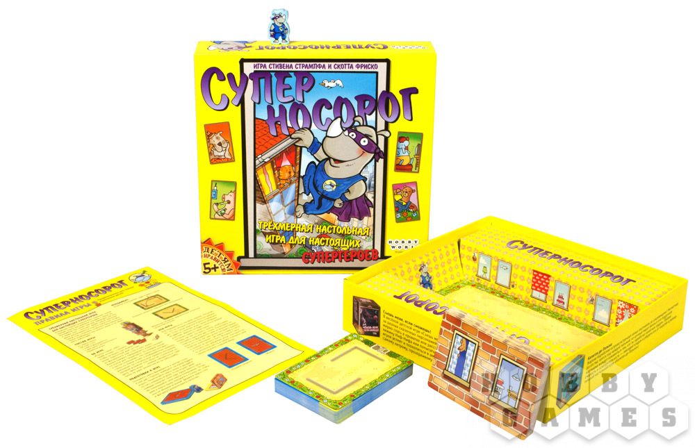 Данная настольная игра проверит вашу аккуратность и предоставит карты крыш и стен для строительства здания. В свой ход вы сможете ставить карты, формируя дом, но делать это нужно будет по определенным правилам, которые диктуются специальными маркировками на картах. Эти символы могут усложнить и либо облегчить задачу, к примеру, следующий игрок пропускает свой ход, либо берет себе дополнительную карту. Не стоит забывать, что носорог хочет подняться на самый верх, а фигурка его довольно тяжела, поэтому следует быть аккуратным и не разрушить всю конструкцию. В этом случае, причастный игрок, увы, сразу проиграет.