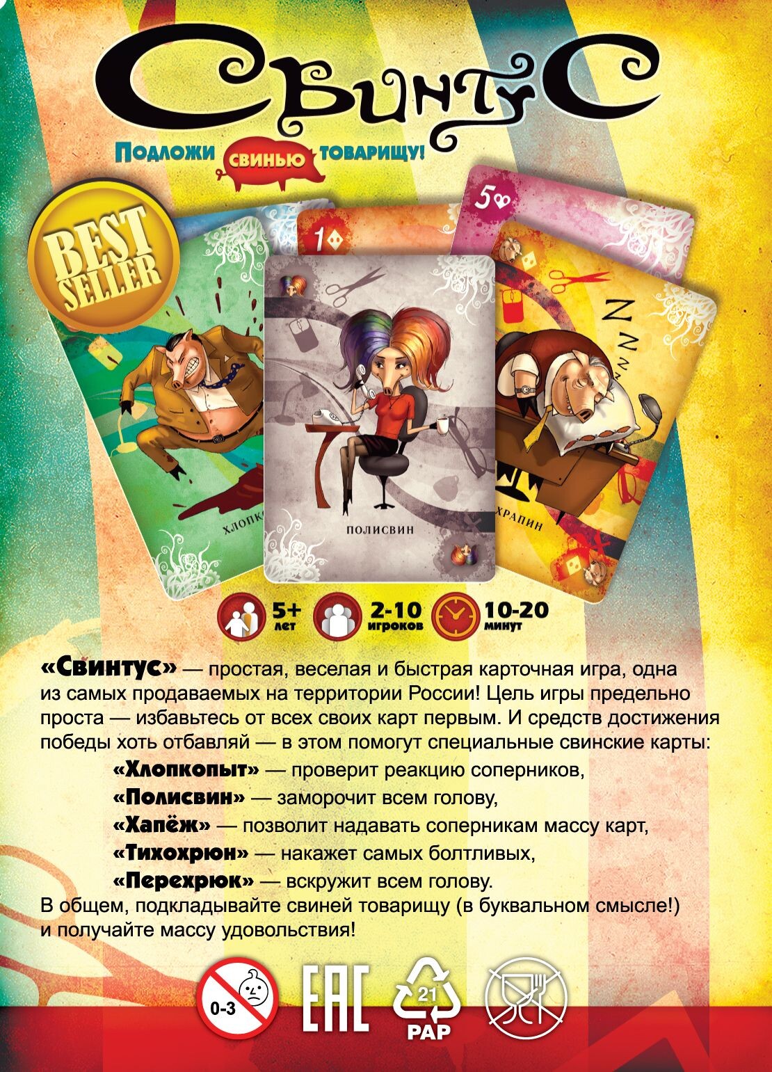 Настольная игра «Свинтус» - быстрая и весёлая карточная игра для 2-10 человек практически любого возраста. Игра стала очень популярна за счёт простоты своих правил, динамичности и настоящего кутежа во время партий.