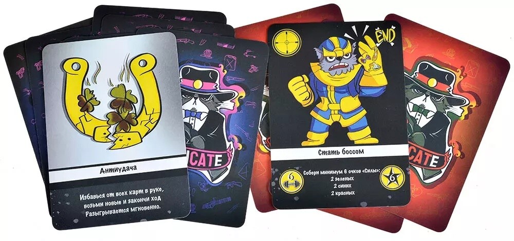 С помощью карт определенного цвета игрокам предстоит выполнять задания разной степени сложности, зарабатывая таким образом очки авторитета. При этом, участники могут всячески замедлять друг друга, ставить им ловушки, применяя различные эффекты и тактики. Кто сможет первым набрать пять очков авторитета, тот и станет победителем!