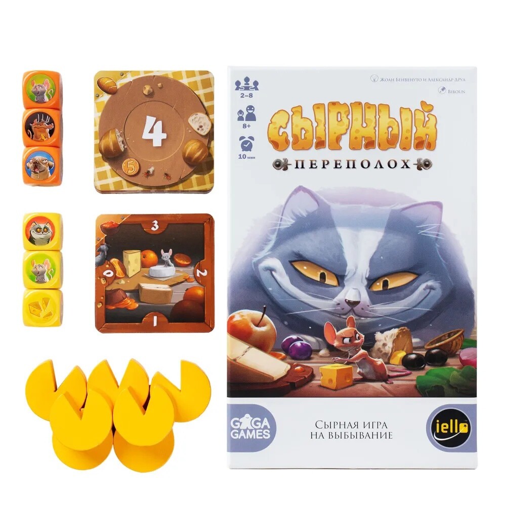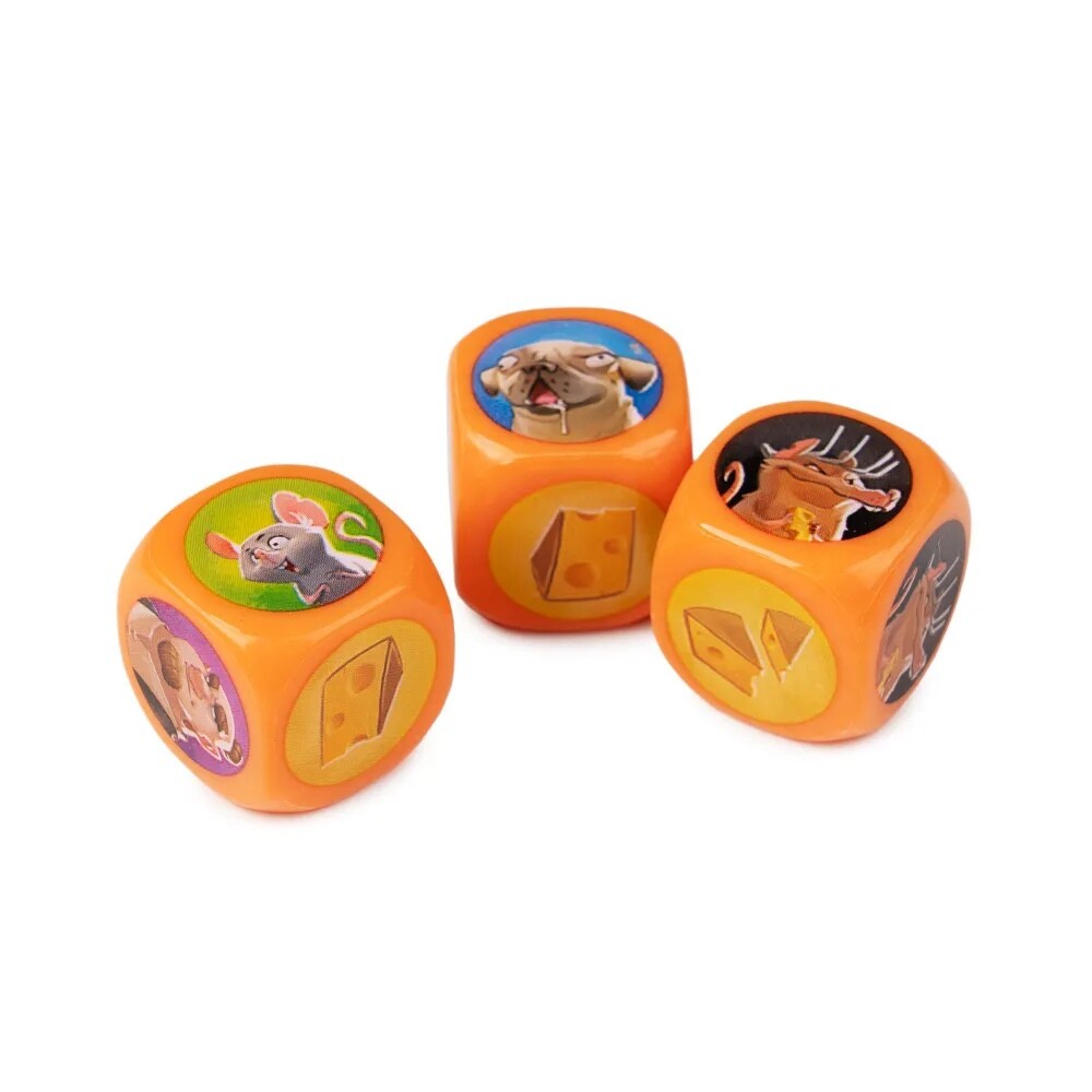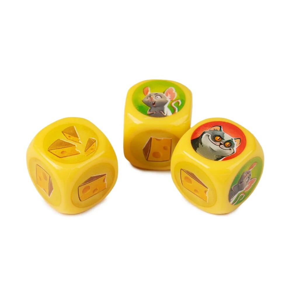 В данной игре от вас потребуется скорость реакции и внимательность. Мыши хотят добыть как можно больше сыра, но им мешает кот, выжидающий своего момента, а кота может спугнуть собака. Бросая кубики, участники стараются понять, сколько на выпавших значениях будет сыра. Ведь если на гранях кубика будут изображения мышей - они съедят сыр, кот отпугнет мышь, а собака спугнет кота. Так сколько сыра получится? Времени на раздумья нет - хватайте жетон с правильной цифрой, а затем проверьте себя. Игрок, который ошибался наименьшее количество раз, станет победителем!