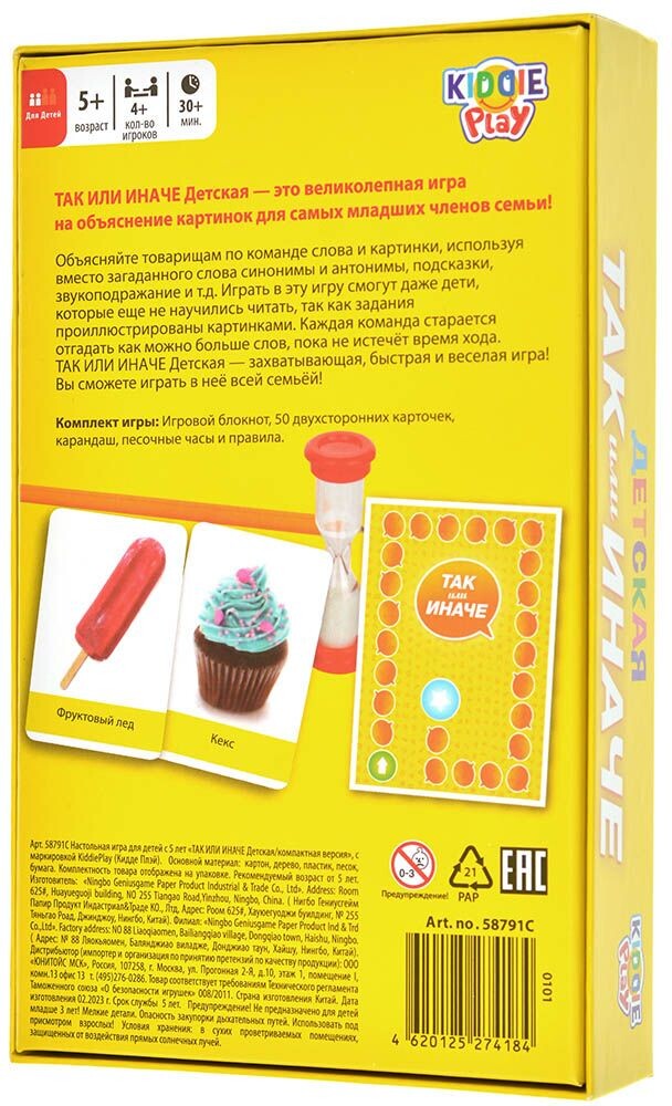В небольшой коробке участников ждут карточки со словами, которые нужно объяснять друг другу за минуту, по песочным часам. Однокоренные слова при объяснении использовать нельзя, а песок в часах неумолимо тает, заставляя торопиться. Сколько слов сможет отгадать ваш напарник по команде, столько победных очков вы получите! Благодаря компактности вы легко сможете взять игру с собой куда угодно и посоревноваться в знании словарного запаса!