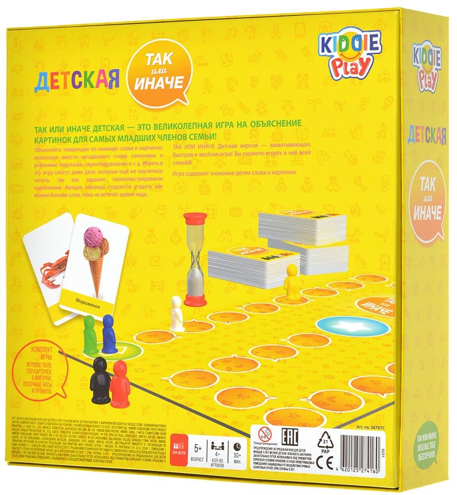Данная игра соберет за одним столом юных игроков и предложит им поделиться на команды по два человека в каждой. Выставив в центр стола песочные часы, участники будут объяснять друг другу слова с карточек, не используя однокоренные и стараясь объяснить как можно больше слов за минуту. Сколько отгадает напарник, настолько фигурка команды продвинется по полю к заветному финишу. Кто первым доберется до края поля, тот и победит! Данная версия отличается от классической более ярким оформлением и более простыми и понятными словами.
