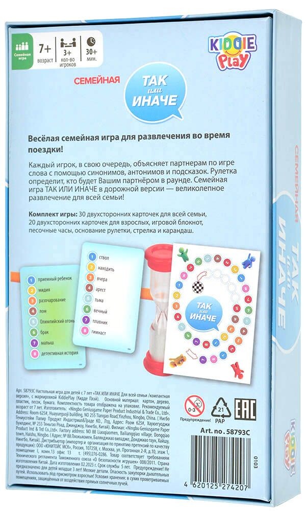В компактной упаковке игроки найдут карточки со словами, которые предстоит объяснять друг другу за одну минуту. Данная версия популярной игры специально разработана для всей семьи, а поэтому сложность слов подойдет как для детей, так и для взрослых. Поделитесь на команды и постарайтесь объяснить своему напарнику как можно больше слов, пока песок в часах не иссяк. Сколько он сможет отгадать, столько победных очков получит ваша команда! Докажите, что вы обладаете наибольшим знанием словарного запаса!